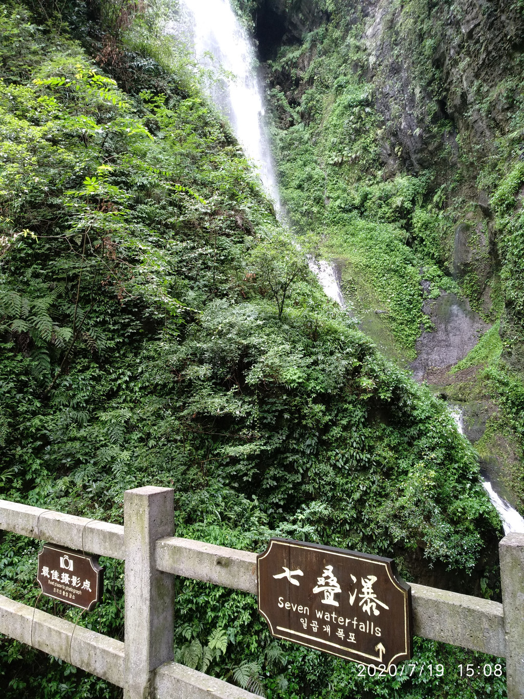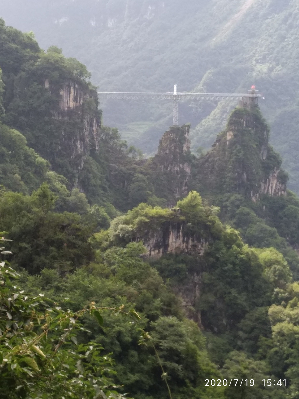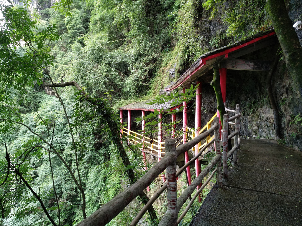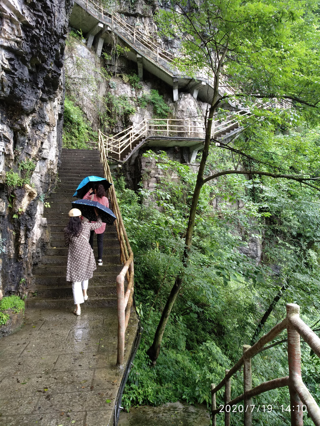 次日上午,预报中的雨却停了。天阴阴的,我们到小溪边戏水。溪水清澈,浪花洁白,溪边的花朵还带着宿雨;山上虽还有些雾气,但比昨晚淡多了。溪风习习,让人忘记了这是酷暑时节。下午我们爬方山时,老天渐渐露出了笑脸,阳光明媚,树上的蝉儿们特别高兴,一起亮开嗓门合唱;而随处可见的山泉瀑布也很是兴奋,不时恶作剧般地从我们头顶倾泻而下,发出响亮的欢笑声,以致我们不得不拿出伞来遮挡。有了它们的陪伴,我们行走在目前世界上最长的绝壁栈道和国内最长的绝壁玻璃栈道上毫不寂寞。