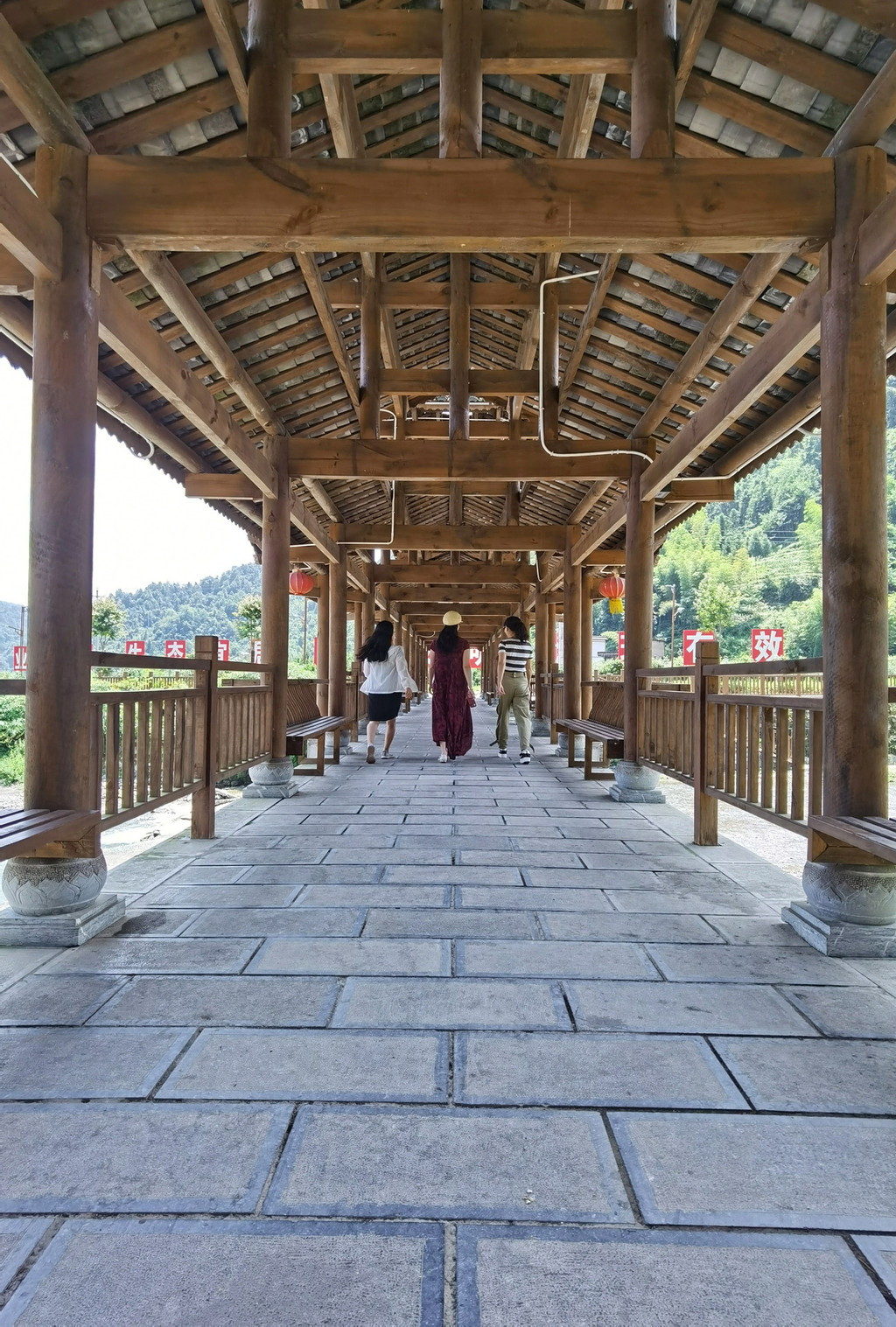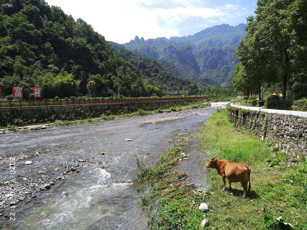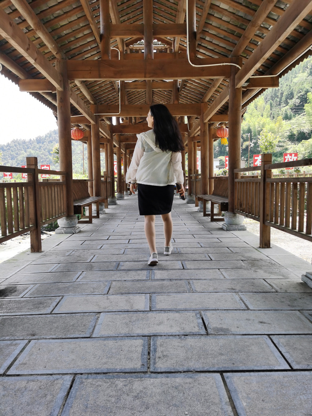二十日上午,预报中的雨仍不知去向。天空湛蓝,白云朵朵,阳光灿烂。我们到方山脚下被评为最美乡村的郑家榜村游玩。这里的房子都是白墙黑瓦,布局整齐;村旁的小溪,浅处可见水底石头,深处则呈现出深绿色,宛如碧玉,温润可爱;溪边草地上的一头黄牛,已吃得肚子滚圆,站在那里,面对潺潺溪水,默默思考着牛生;溪上的风雨桥,古色古香,我们忍不住把它当作T台走了一遍又一遍;而远处山峰在蓝天白云的烘托下显得格外巍峨险峻。此时所见到的一切,同我们第一天所见相比,它们不再是一幅幅水墨画,而是色彩绚丽的油画!
