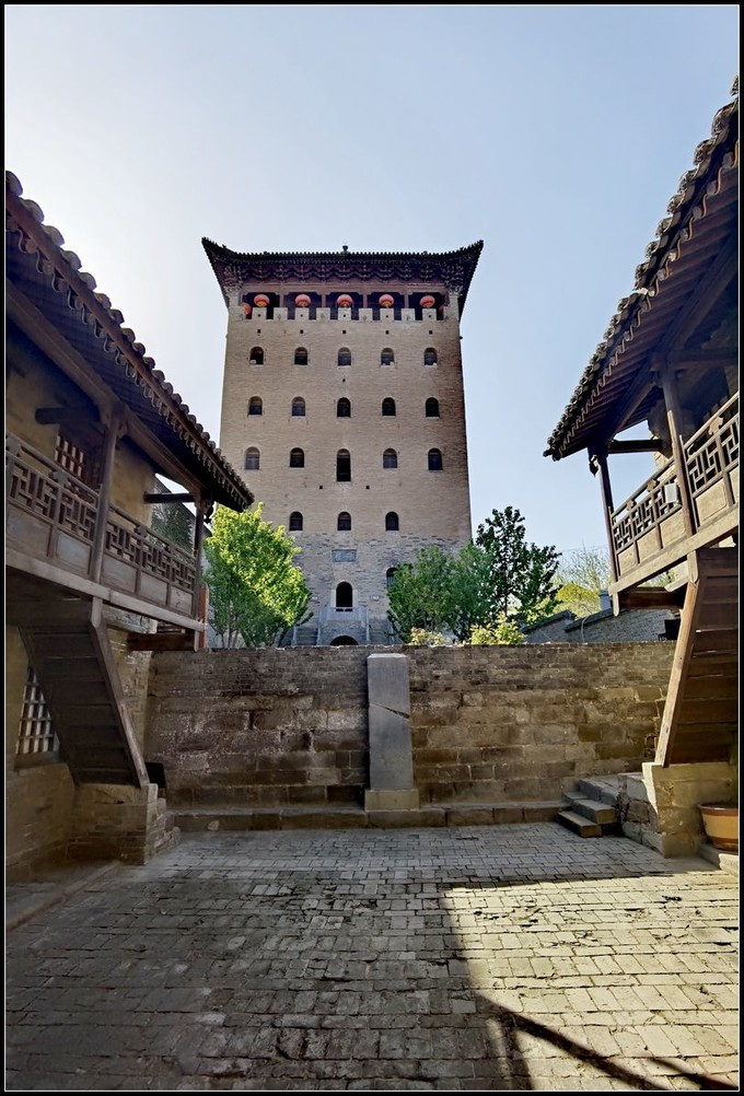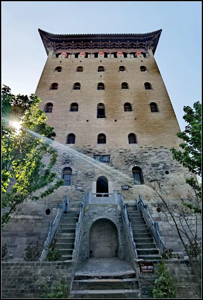 郭峪古城郭峪古城中最高的建筑豫楼,位于村子中央,建于明崇祯十三年(公元1640年),是为防御 陕西 农民军的军事建筑。楼长15米,宽7.5米,高30米,7层构成。底层墙厚2米,每递高一层,墙递缩0.15米,直至第7层,墙厚0.8米。第一层为暗层,第二层为5孔砖窑构成,朝东正中门额上镶有王珩于明崇祯十三年所题豫楼二字,有炮眼4个;三层以上,均为梁檩木板盖顶,七层之上四周为砖堞;砖堞之上,又起檐封顶。楼顶四角,挂有四个钟铃,经年累月在风中叮咚作响。