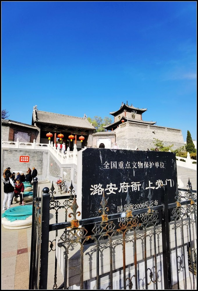 上党门上党门始建于隋开皇年间。唐玄宗李隆基任潞州别驾时,在衙署内 大兴 土木,增建飞龙宫、德风亭。最盛时亭堂楼宫有280余间。经过历代多年的兵火战乱,以及人为的毁坏,现在府署内的建筑已大部不存。现仅存大门、钟鼓二楼、府二堂、办公院、西花园等建筑,上党门是 长治 市极具代表性的古建筑。
