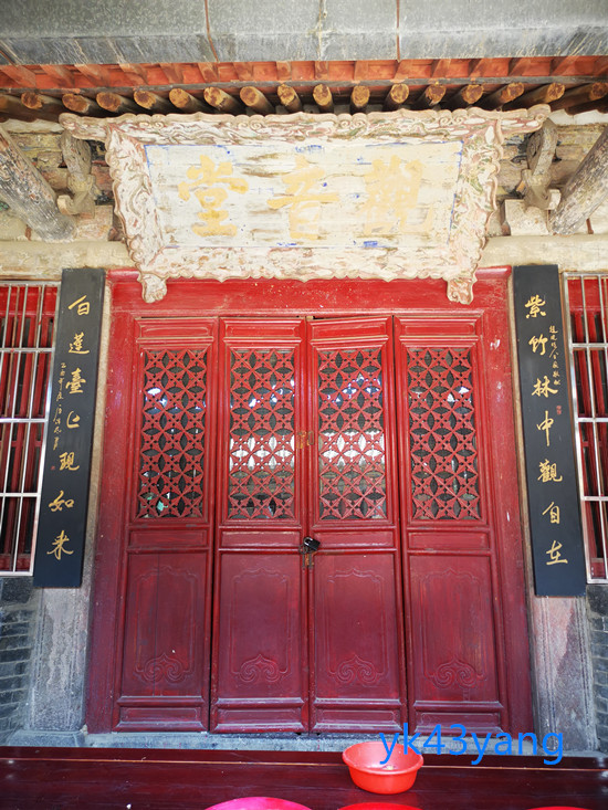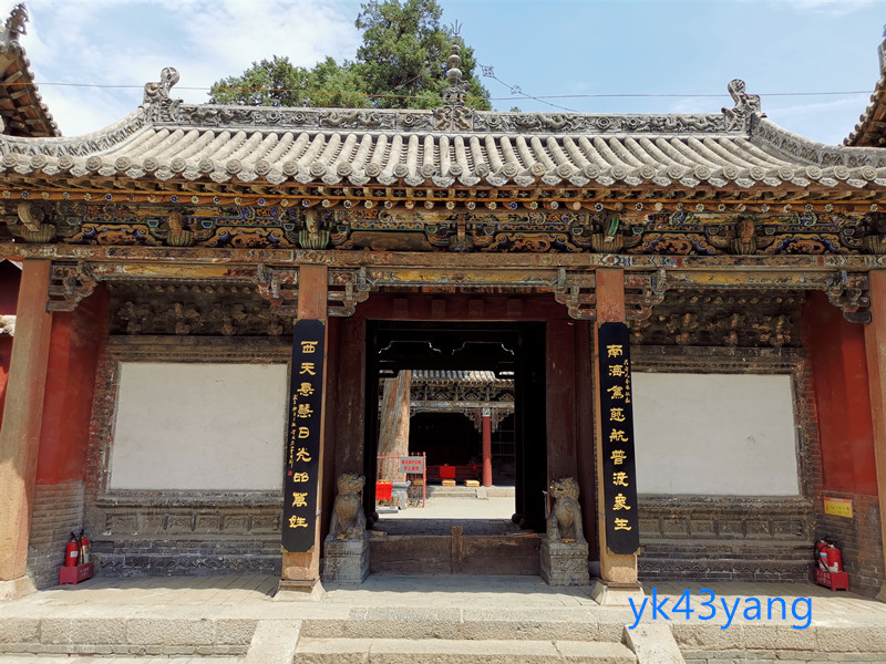 从侧门直接进入观音堂的一进庭院。庭院正面是中轴线上的天王殿。天王殿座东朝西,三间面阔,悬山顶,门前设廊。廊柱上挂有抱柱楹联。题曰:“南海驾慈航,普度众生;西天悬慧日,光照万姓”。窃以为“慈航”是指菩萨普度众生的慈悲心,并非舟船名称,动词“驾”有些不妥。“慧日”是指佛祖的智慧犹如日月普照众生,所以“悬”字也不恰当。“万姓”是生造的词汇,不如改成“万民”。所以对联改为“南海慈航,普度众生;西天慧日,光照万民”似乎更恰当一些。