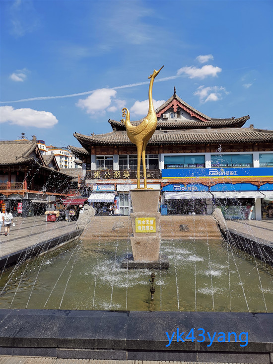 穿过宏门,是宽广的城隍庙广场。广场两边都是商业店铺。中央有一座喷水池,水池中立着一座仙鹤雕像,不知道有什么象征和讲究。