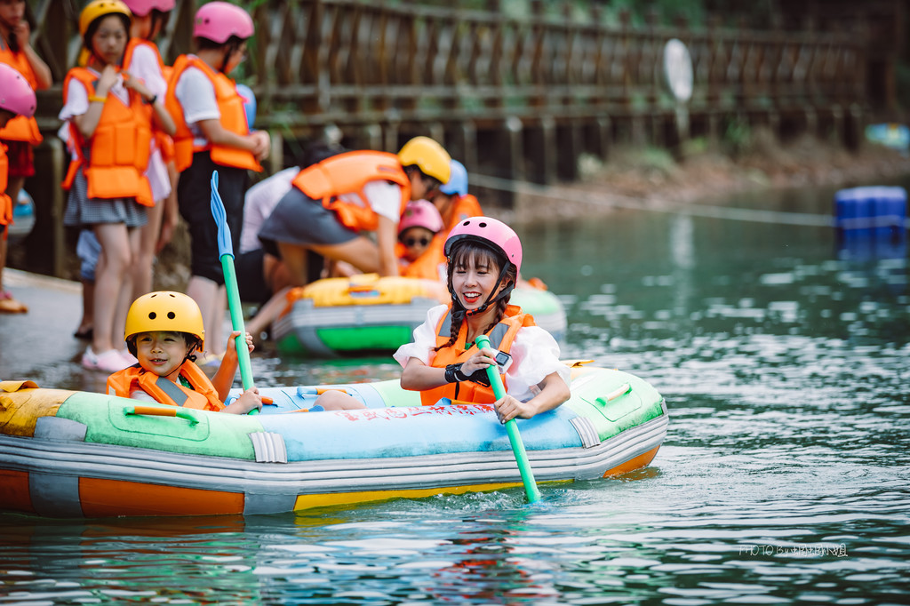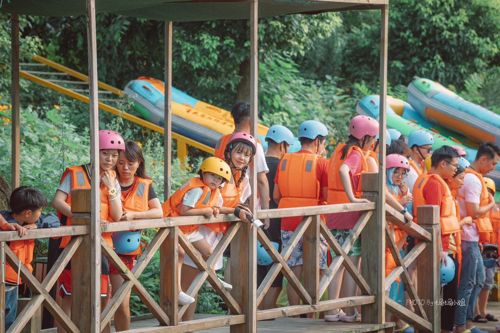 夏日漂流的人很多,大家又多会选择下午去玩,所以建议是一定要做好充足的时间预算,提早排队。终于轮到我们上船了,为了帮叮当留住成长道路上的每一个精彩瞬间,牺牲了爸比在岸边拍照,这次,就由妈咪单独带着叮当一起,开启一段奇幻漂流之旅。