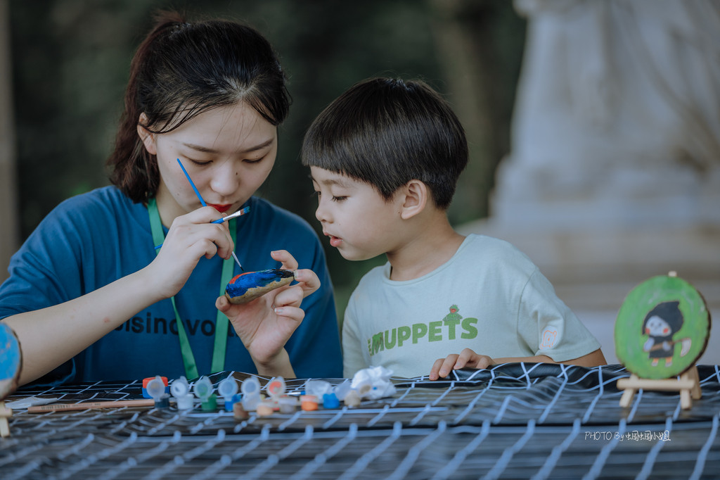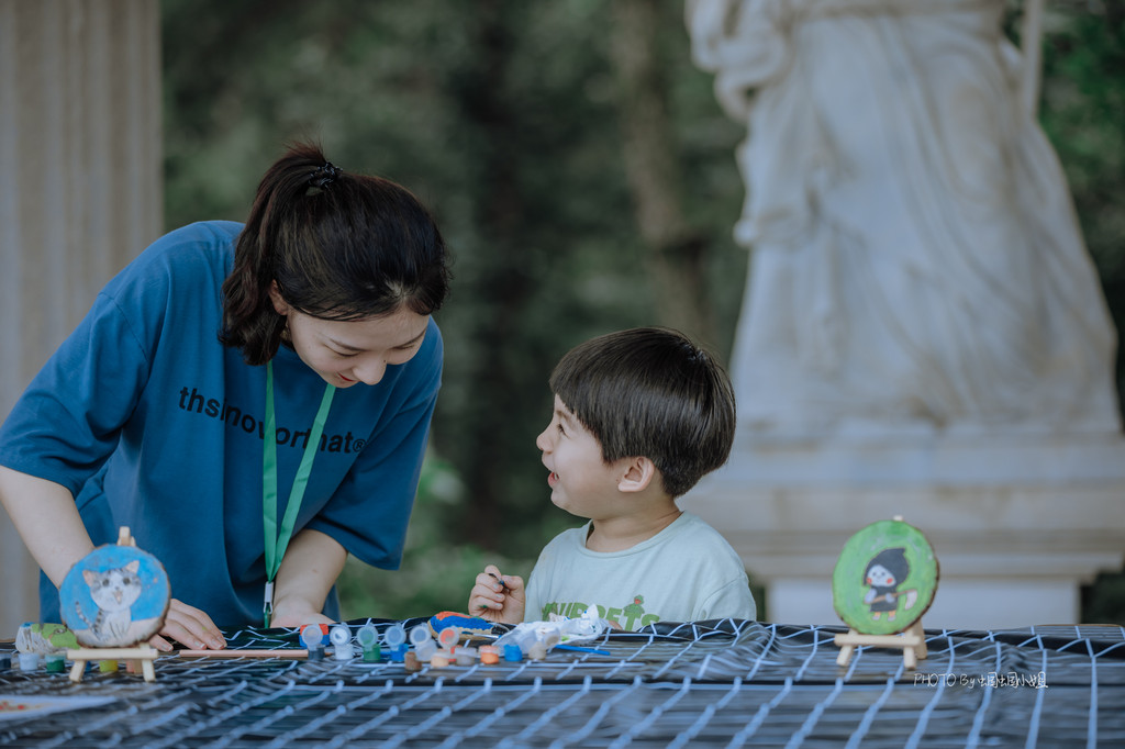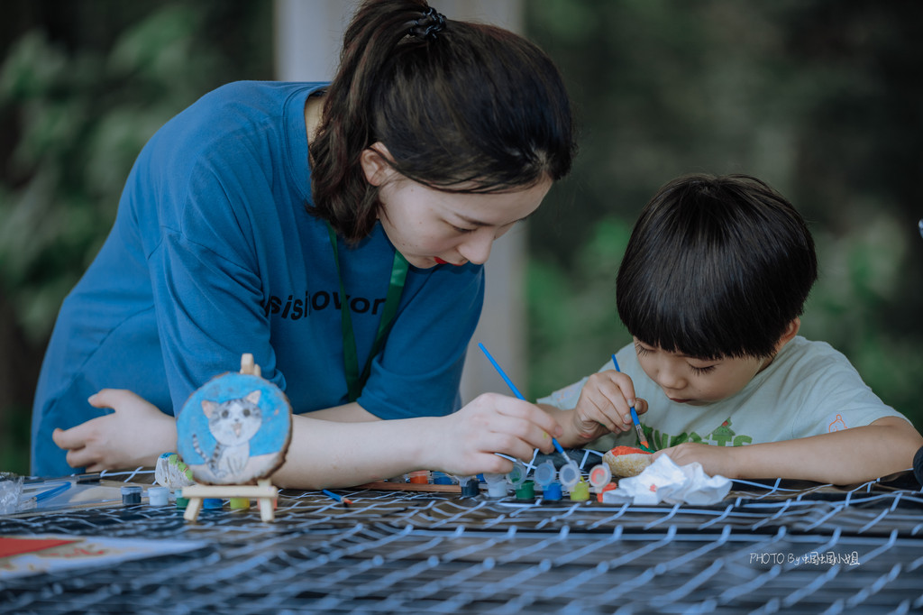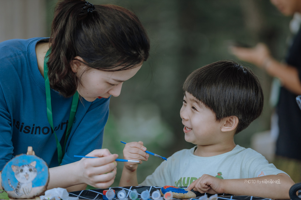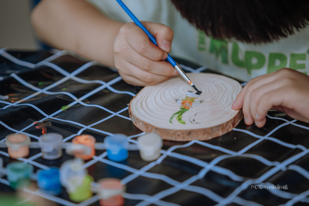 年轮画、石头画,分别在拥有着一圈圈年轮的树干横切面上和石头上画画,小朋友可以天马行空的描绘,一旁还有耐心的G.O.辅导着他们,帮助他们完成一幅完美的作品。