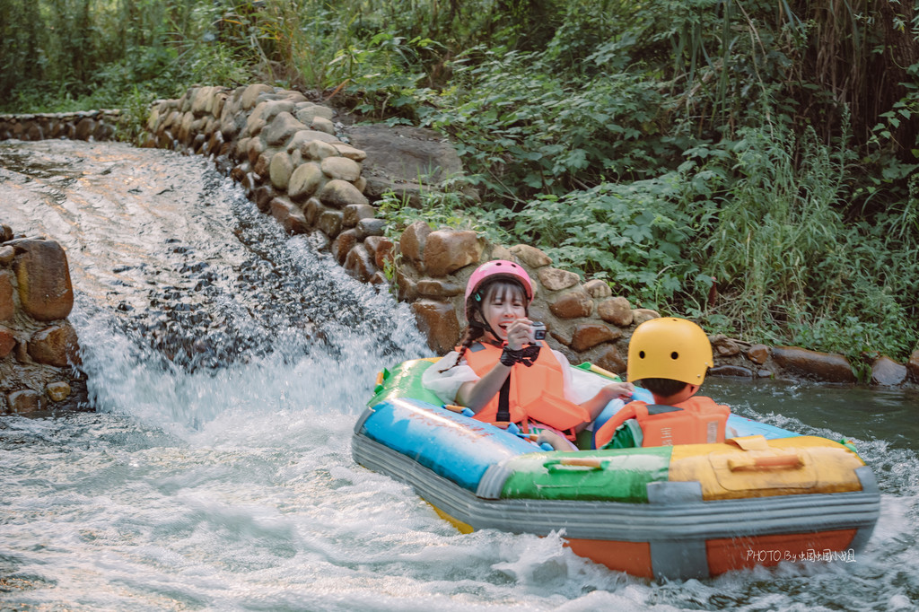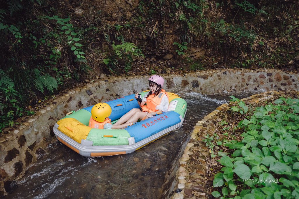整个漂流的河道虽然是人工打造而成,但却也是依着山势和水势,顺流而下,一条湍急的小溪蜿蜒盘旋在郁郁葱葱的森林之中,水流时而湍急,顺着陡坡俯冲而下,让我们尽享漂流的刺激,也时而有平缓的路段,放下相机、放下划桨,就安静的飘忽在这幽静的丛林之间,闻花香、听蝉鸣,尽享夏日丛林的美好。