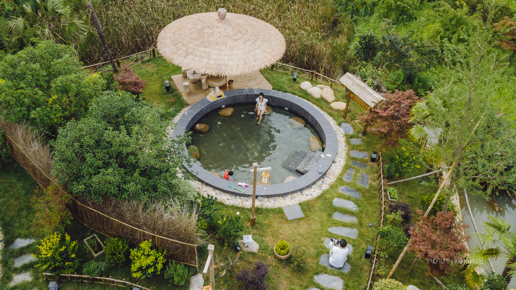 这里面有各种形状的泡池,像什么太极池、无极 池、星空池......最有意思的是还有一个铁锅池,尤其是冬天过来,跳进一池温水中,腾腾的热气氤氲而上,来一个铁锅炖自己,也别有一番趣味。