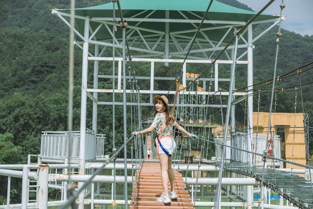 在大草坪的旁边,还有一个高空项目区域,最近几年比较火的悬崖秋千、高空吊索、玻璃栈道、步步惊心等高空项目,在这里都可以玩的到。