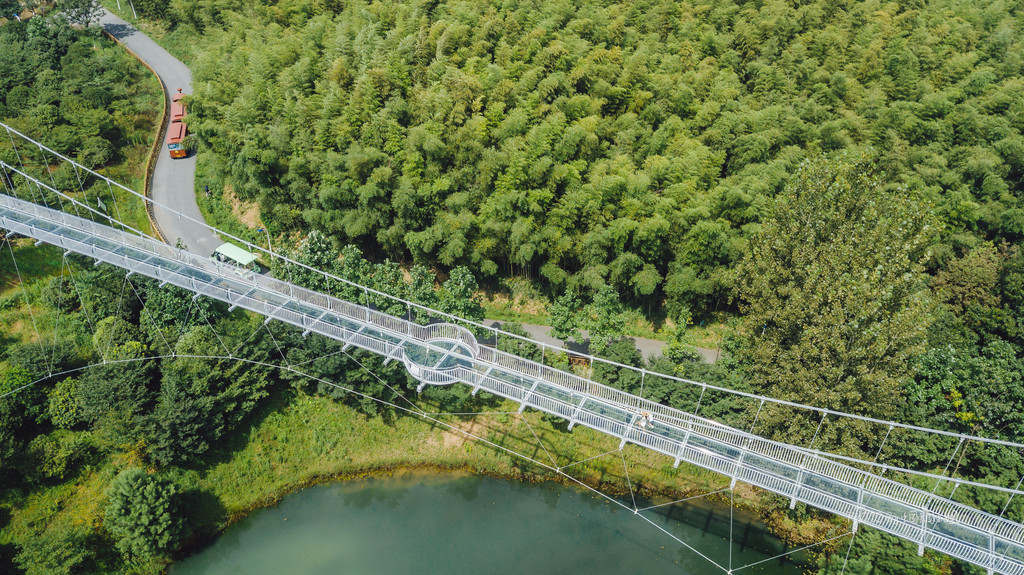 航拍视角下的玻璃栈道,仿佛碧波中的一条宝石绿的缎带,美出天际。