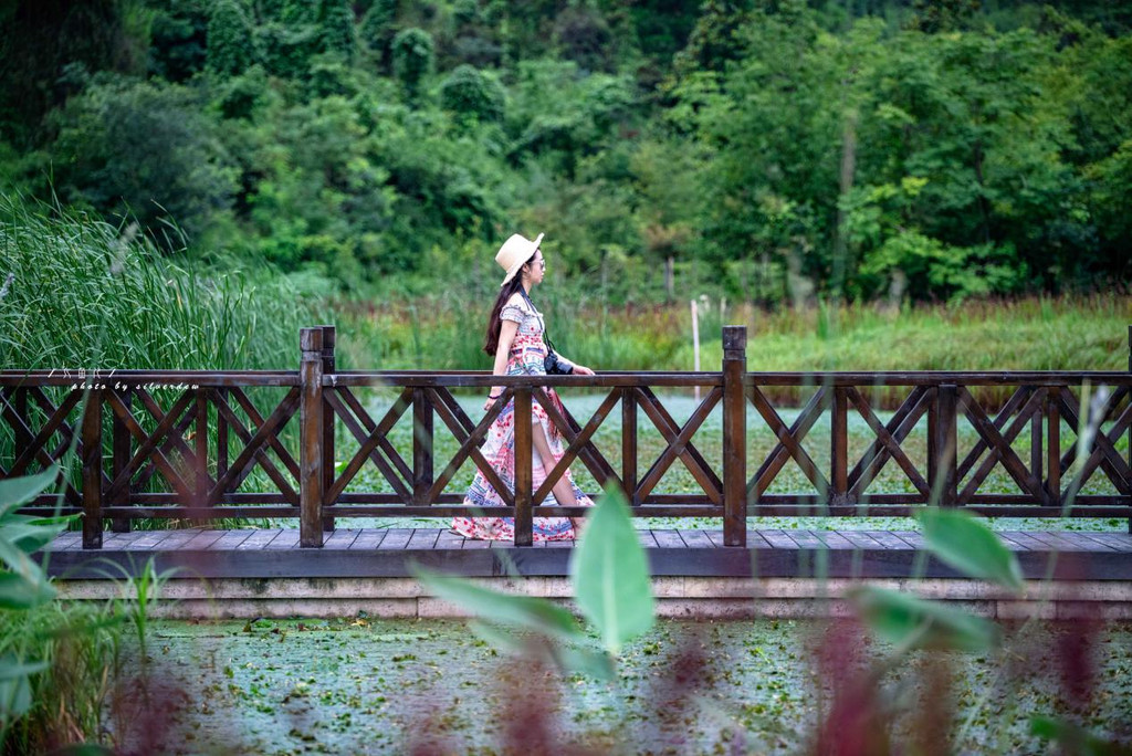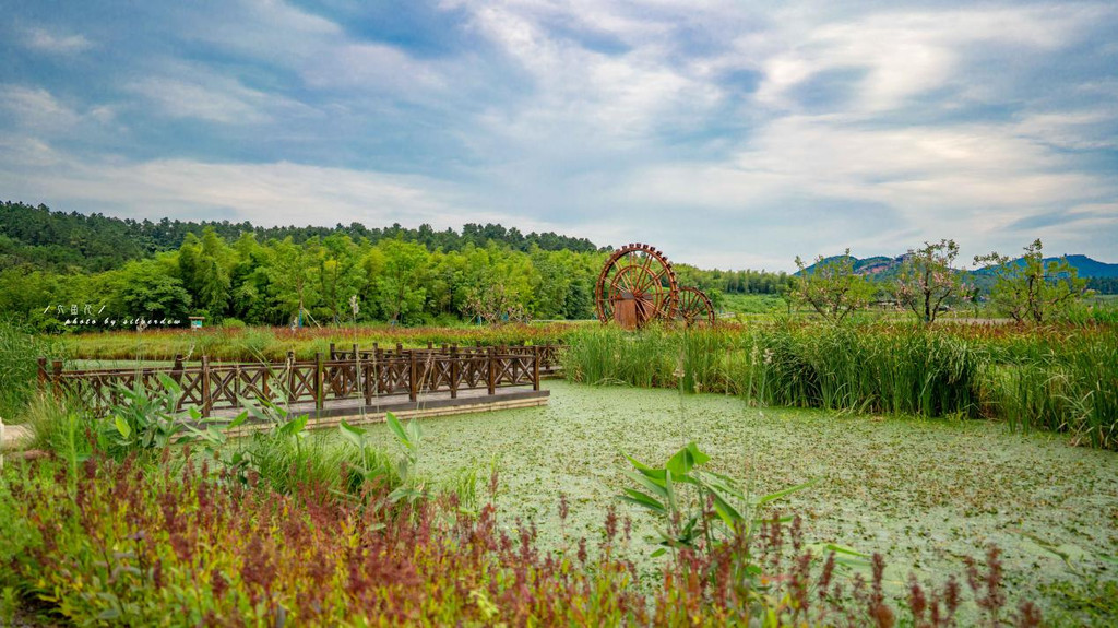 无需刻意去寻某个地方,某处风景,只需仙姑村内缓缓步行,便处处是风景,在公路边上看见个仙姑湿地的牌子于是我们顺着这条小路向前走,沿途有生态茶园、有机稻田、还有稻田水车。