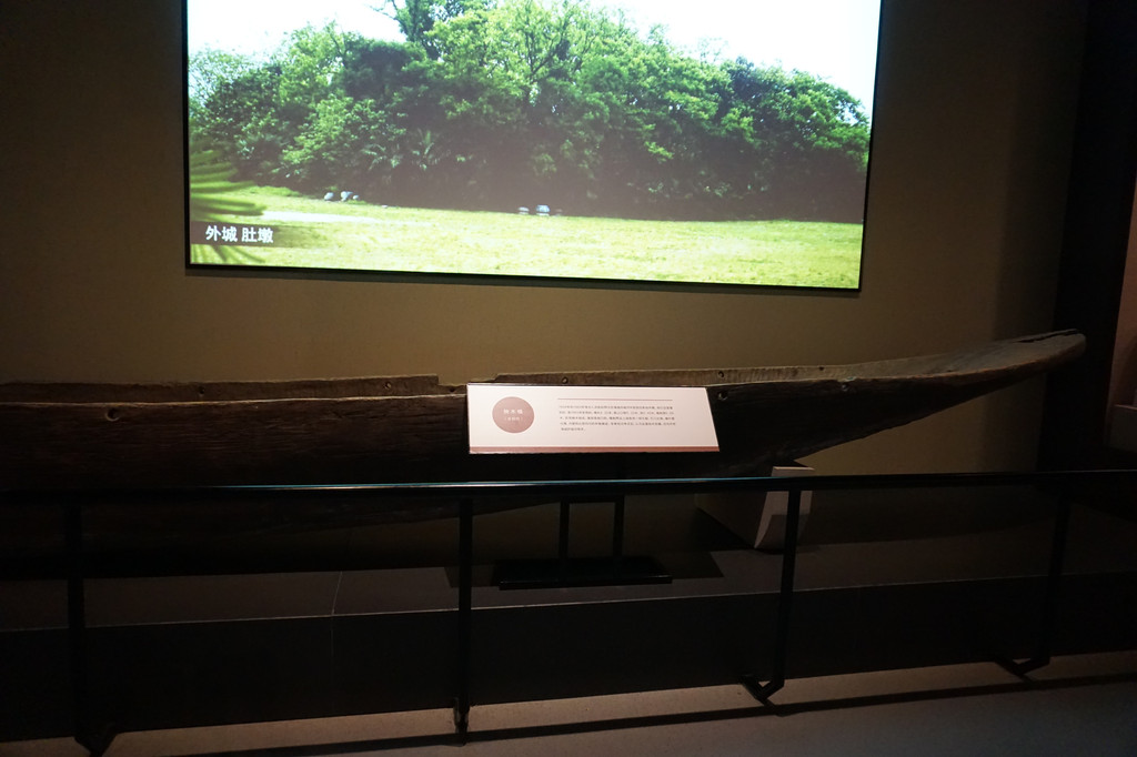 这里展出了独木撬的复制件。独木撬用整段楠木砍削而成,尾部敞口,学者经过考证后认为这是独木泥撬,用以开挖护城河,运送淤泥。