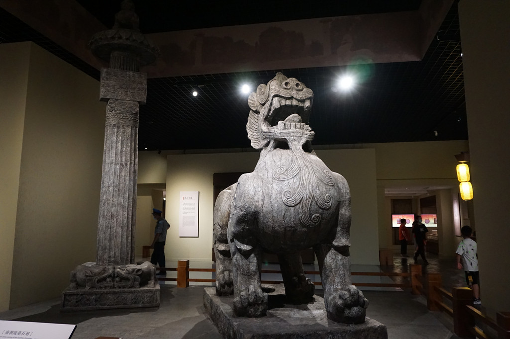 南朝陵墓石刻中的神兽和神道柱的复原展示。