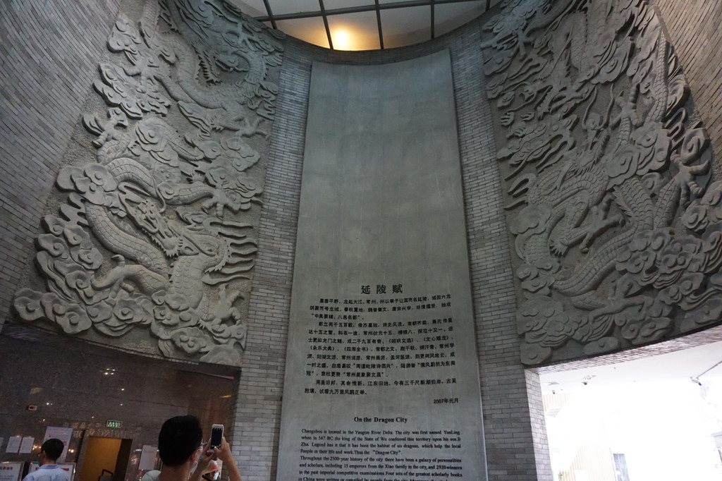 一进门的高大的中庭,一个圆柱形的四壁建筑,墙壁上有“延陵赋”,还有龙腾的石雕从天而降,气势逼人。看了介绍知道,延陵、毗陵、晋陵、兰陵是不同历史时期常州的称呼。龙城则是常州的别称,是由六朝萧梁时的六龙城引申而来,而腾飞的龙正是常州的历史发展、社会进步的象征。