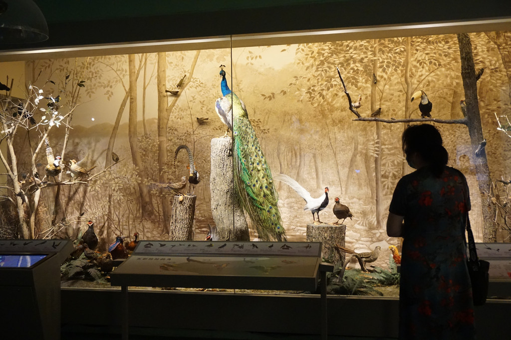 "鸟类王国"主要展示美丽的山地珍禽。淡淡 的水墨画背景前,花草点点、绿树成荫,多种珍禽争奇斗妍。