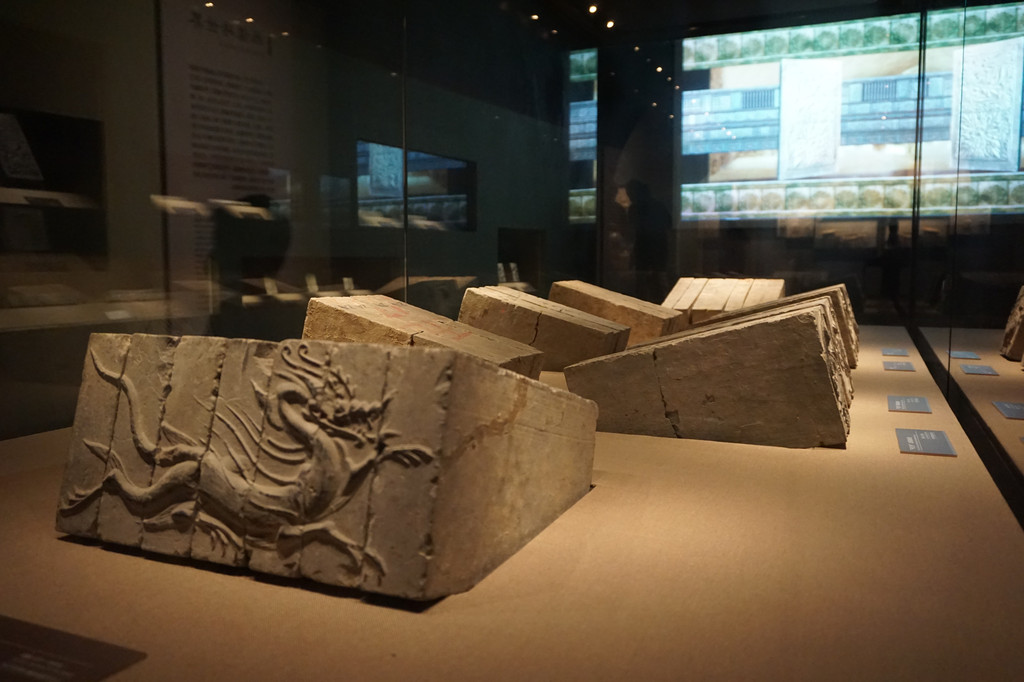 这里展出的是古代特制的墓葬用砖——画像砖。画像砖极富立体感,内容多样。橱窗中的是一组龙纹砖,它是国家一级文物,它由7块画像砖拼接而成。龙在中国古代被视为四神之一,是汉代以来最为流行的装饰图案。这组龙纹砖整个图案呼啸奔腾的气势富有强烈的运动感和力量感。