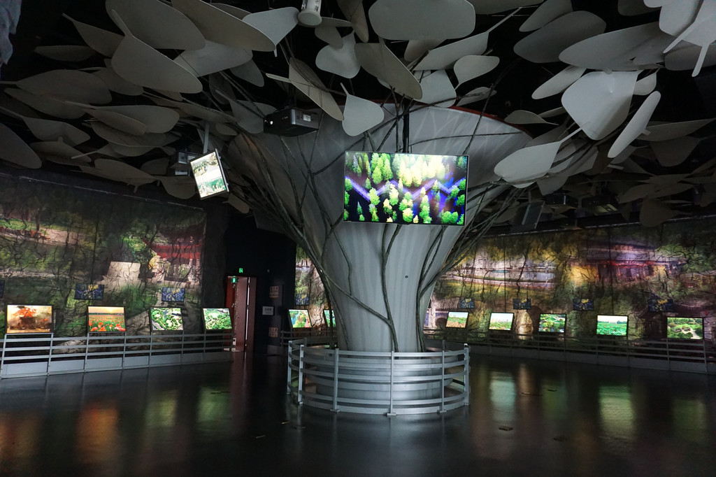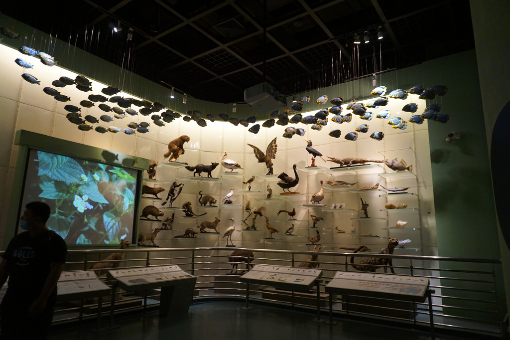 多种奇奇趣趣的野生动物标本被错落有致地组合在这个高大的玻璃展厅内。大投影中通过视频的形式也为我们展示了野生动物们的活动状况。科技视频加音响喧染,一幅纷繁多样 、生机勃勃的自然画面呈现在我们面前。