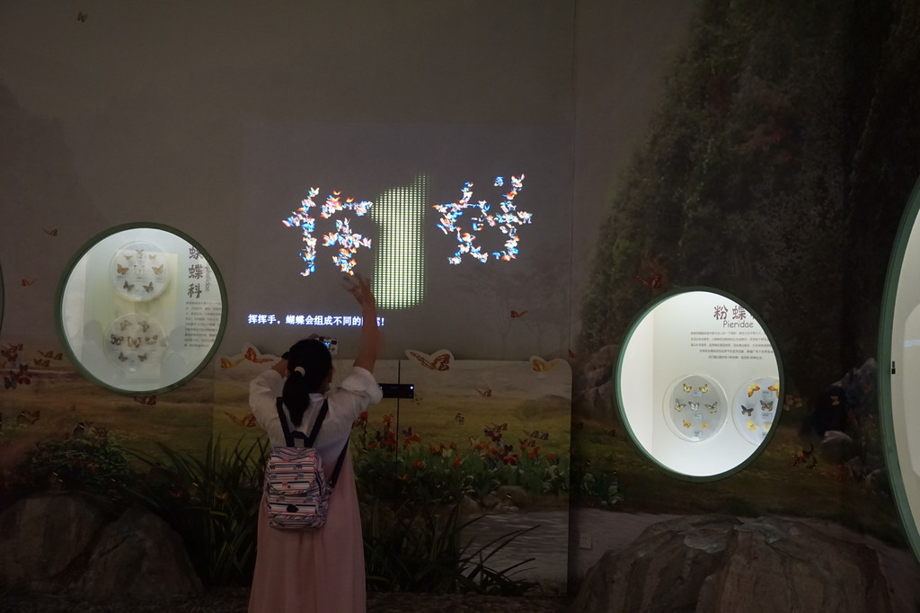 一组连续的生命进化图的灯光片,通过图片与文字向我们介绍了每一个地质年代的代表动物。为增加少儿朋友学习探索的兴趣,展览中还设置了多个互动性项目。这里就可以通过你的手势把你想表达的在大屏幕上显示出来。