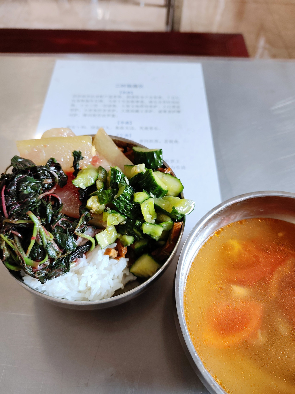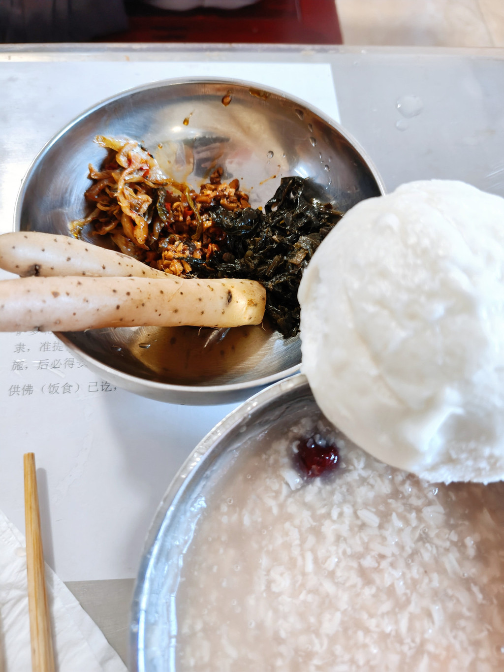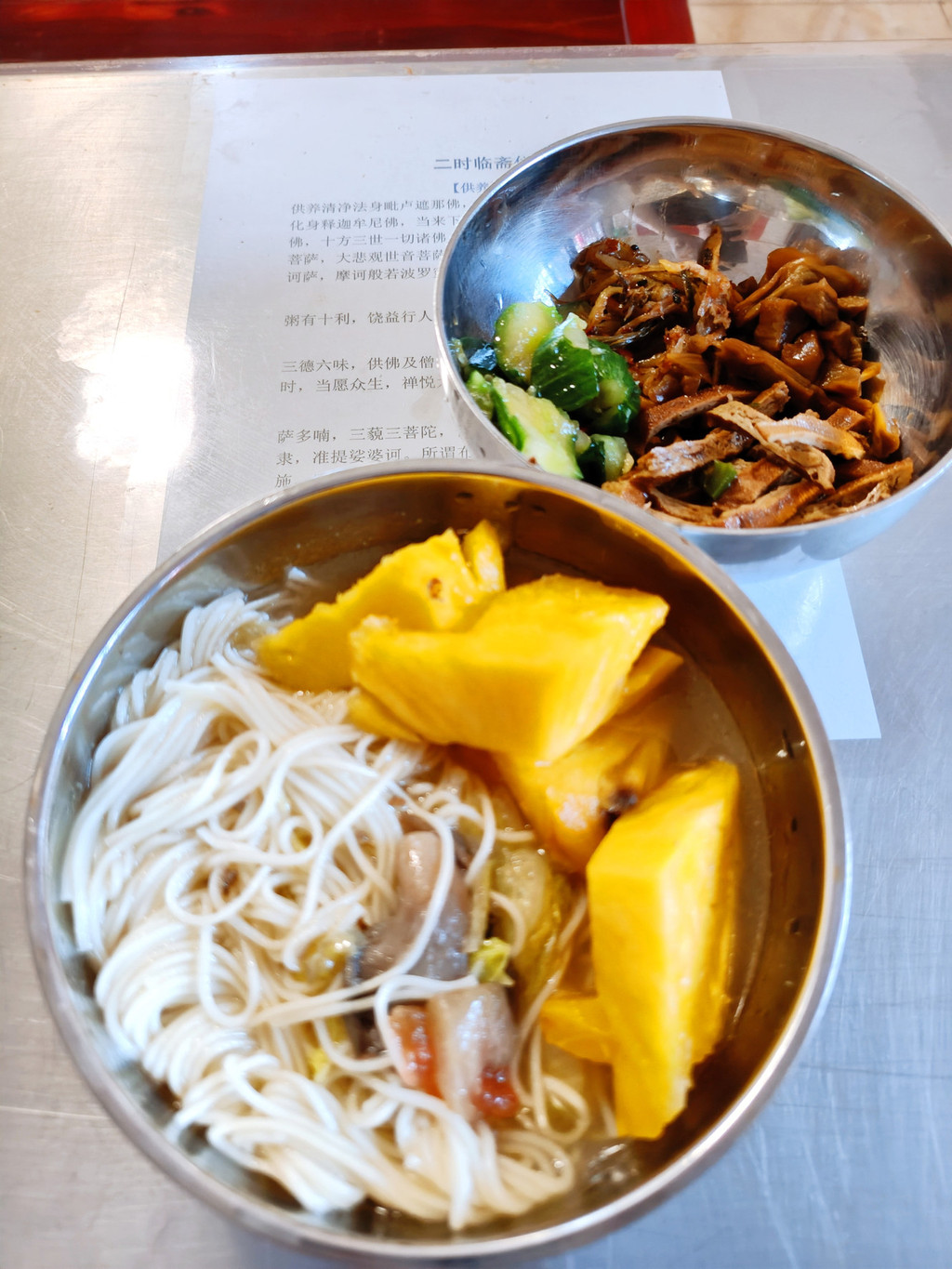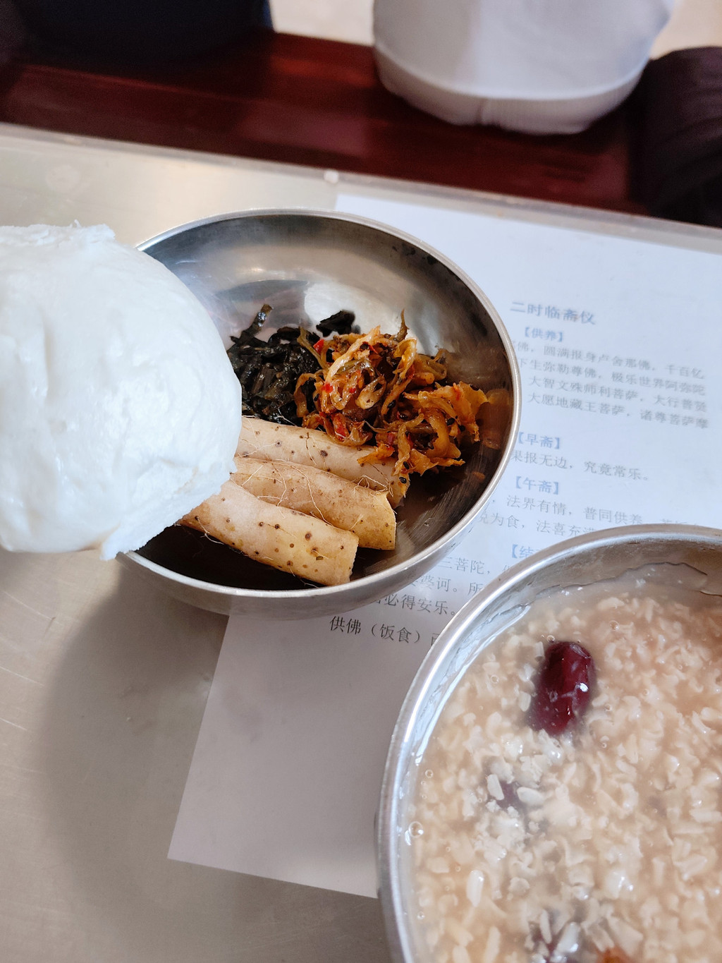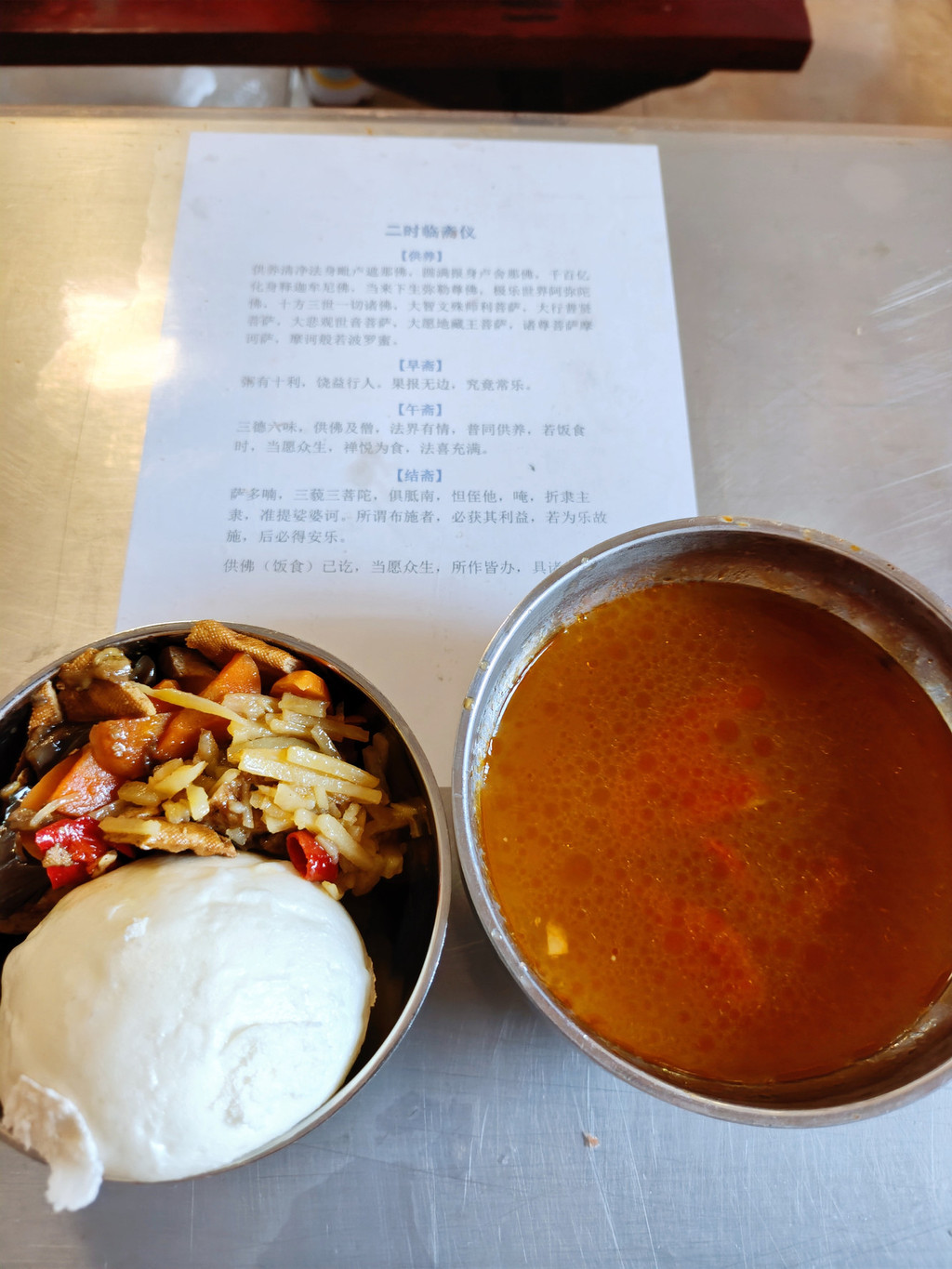 寺院的一日三餐全是素食,却吃得格外香甜。食材大多来自后山菜地,由僧人和居士们亲手种植,纯天然无污染。新鲜的青菜、清甜的豆浆,连黄豆都是当天现磨的,这种原汁原味的滋味在城里很难尝到。每顿饭四五个菜,搭配均衡,饭后还有水果或罐头,既健康又满足。