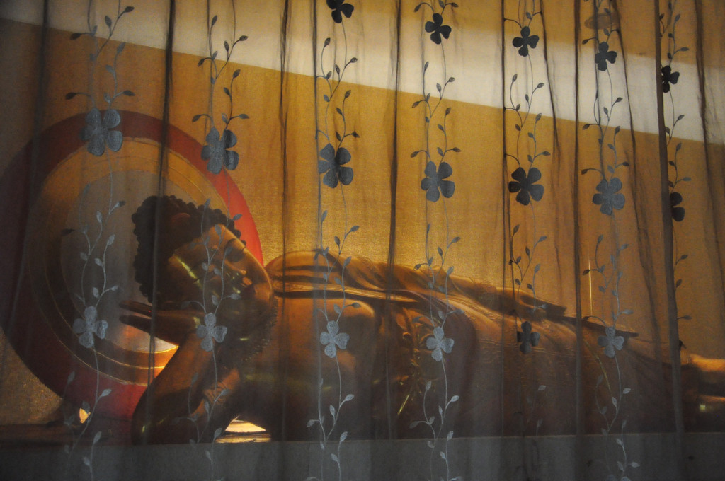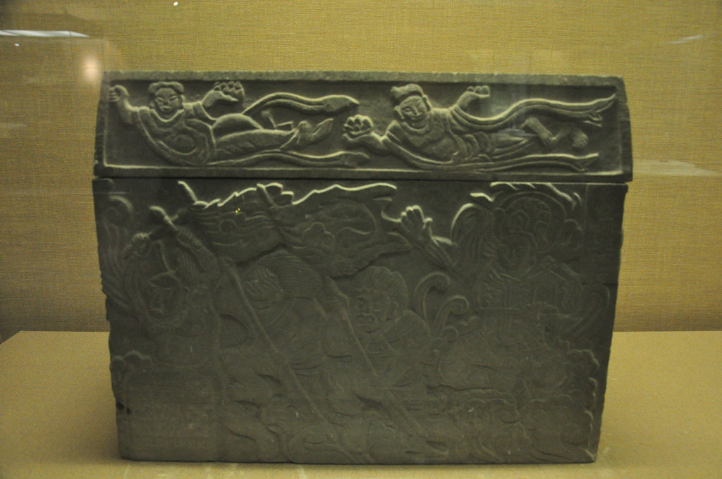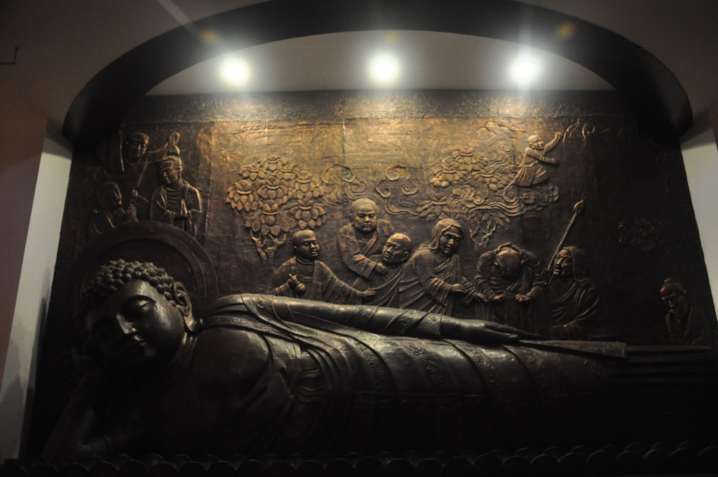 下午2点,博物馆开门,我们进馆参观。北塔博物馆馆舍为仿汉唐建筑,粉墙黛瓦,古风弥存,展厅分为地上、地下两部分。地上一层中央为以大型铜雕《佛祖涅槃像》为主题的序厅。序厅两侧分别为大型沙盘,东为“三燕龙城全景”,西为“朝阳老城全景”。正厅入口两侧为古塔百科图片展。