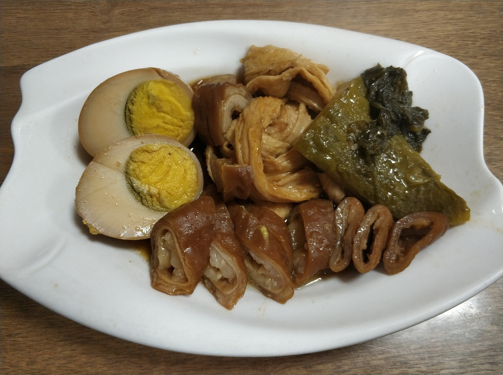 三个人三碗粿汁,泳子推荐给我的卤料有猪肠、腐竹、卤蛋,还点了招牌的卤苦瓜也不管我们吃不吃,阿萍把猪肠换成卤笋,其它都一样。
