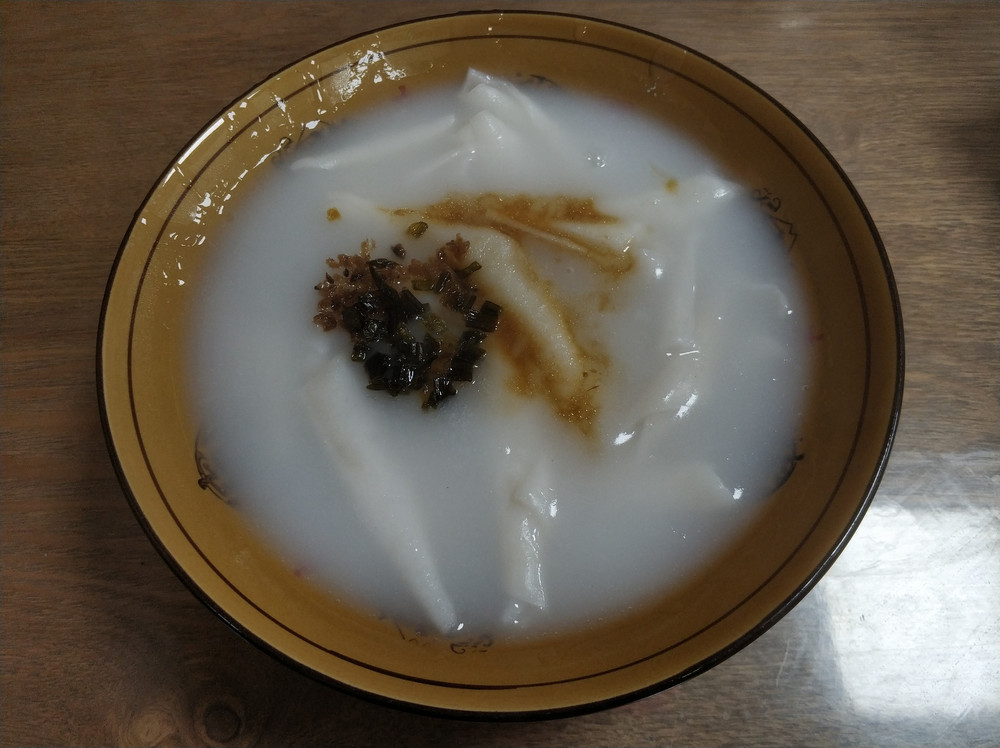 粿汁是用大米粉加水调和出来的,米香十分浓郁,粿汁里菱形的粿皮经过晒干处理,很有嚼劲和弹性。前几天在汕头吃的粿汁,粿皮是长条形类似面条那种,比较柔软,入口即化,风格完全不同。