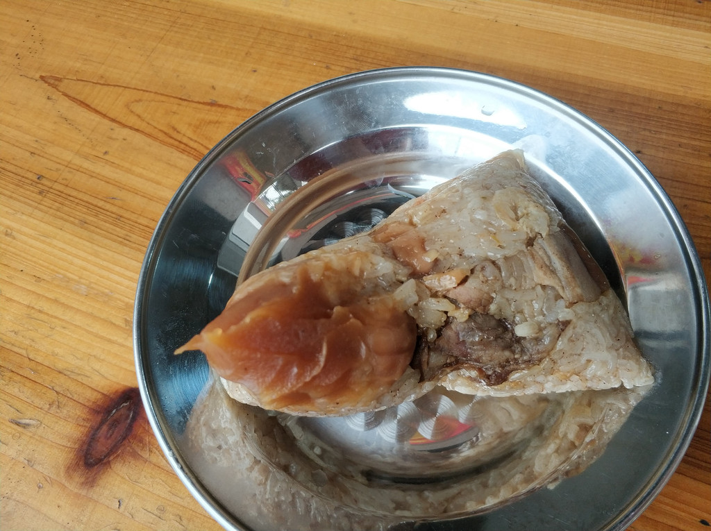 “大约20多分钟到了龙湖寨,泳子已经等待多时了,手里提着两只粽子笑吟吟地递给我们,这是连拮雨这个正宗潮州人都没吃过的江东镇特产粽子。粽子里的佐料很丰富,有瘦肉、绿豆、香菇,鹌鹑蛋和板栗是更令人意外的收获。
