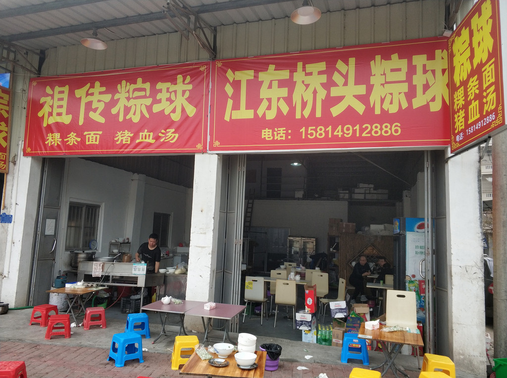 老板是个本地中年男子,也许因为现在是下午的顾客低峰时间,店里只有他一个人在操持,桌上、地上还没来得及收拾干净。店招上特意写着“祖传粽球”,但是除了粽球,也供应粿条、面、汤之类的小吃。