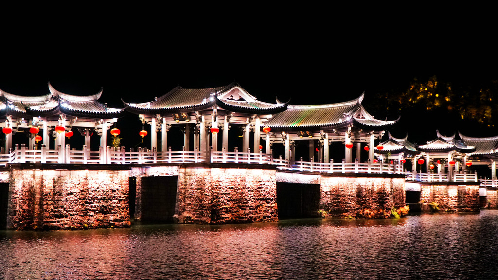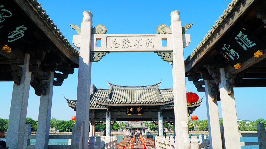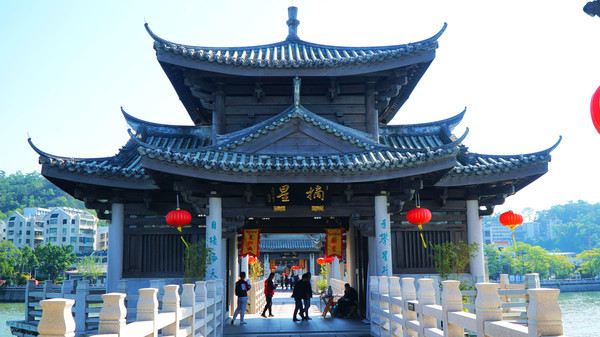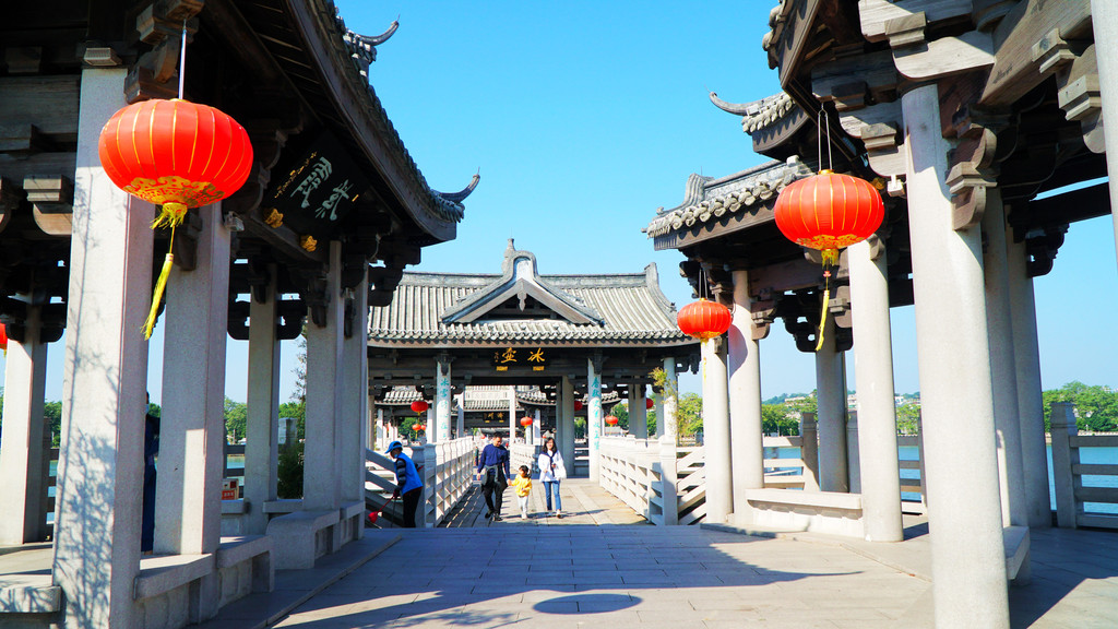 既然是仙、佛造的桥,它肯定不是一座普通的桥,只见它结构奇特,四不像,集梁桥、浮桥、拱桥于一体,两端是拱桥,接着往中间是粱桥,再往江中心则是舟桥,而梁桥由桥墩、石梁和桥亭三部分组成,桥亭与桥墩一一对应,形态多种多样,外观平稳威严,桥亭之大犹如大殿。