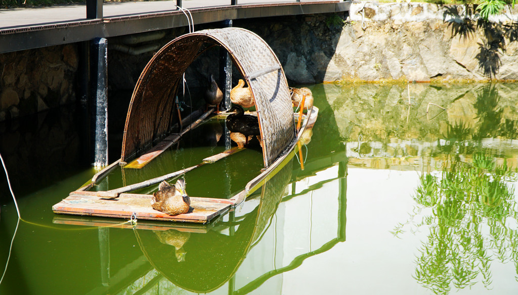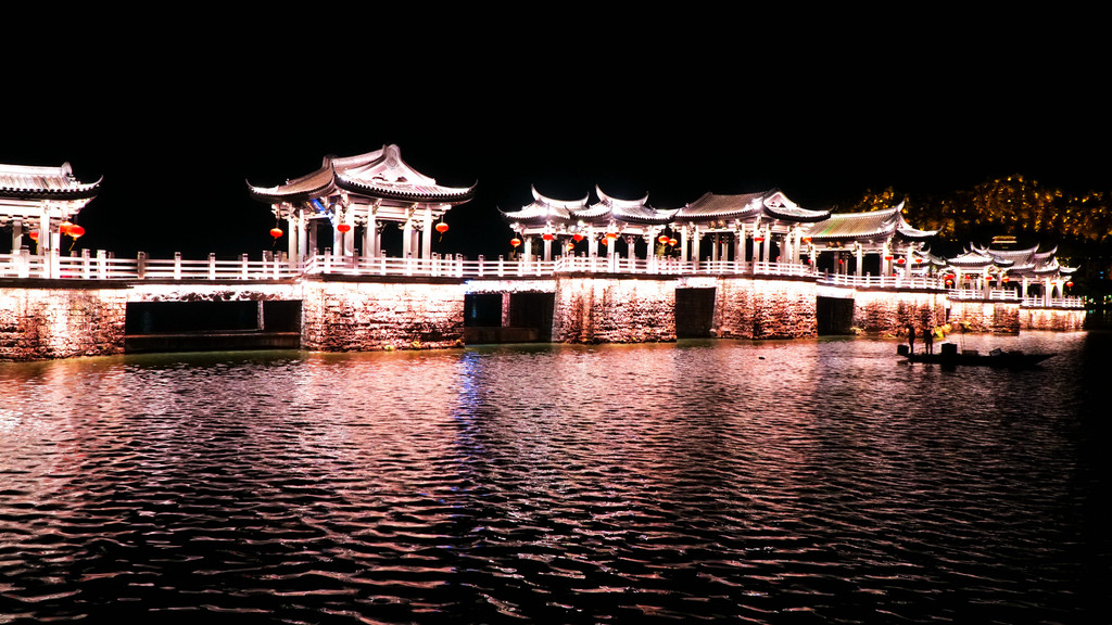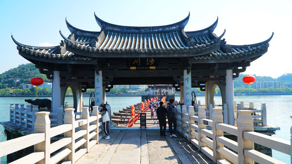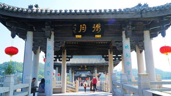 走一小段石板桥便有漂亮的桥亭供游客休息观景,把亭台楼阁建在桥上,这在桥梁界属孤例,从结构上说,梁舟结合,首开世界上启闭式桥梁之先河,让世界称奇。