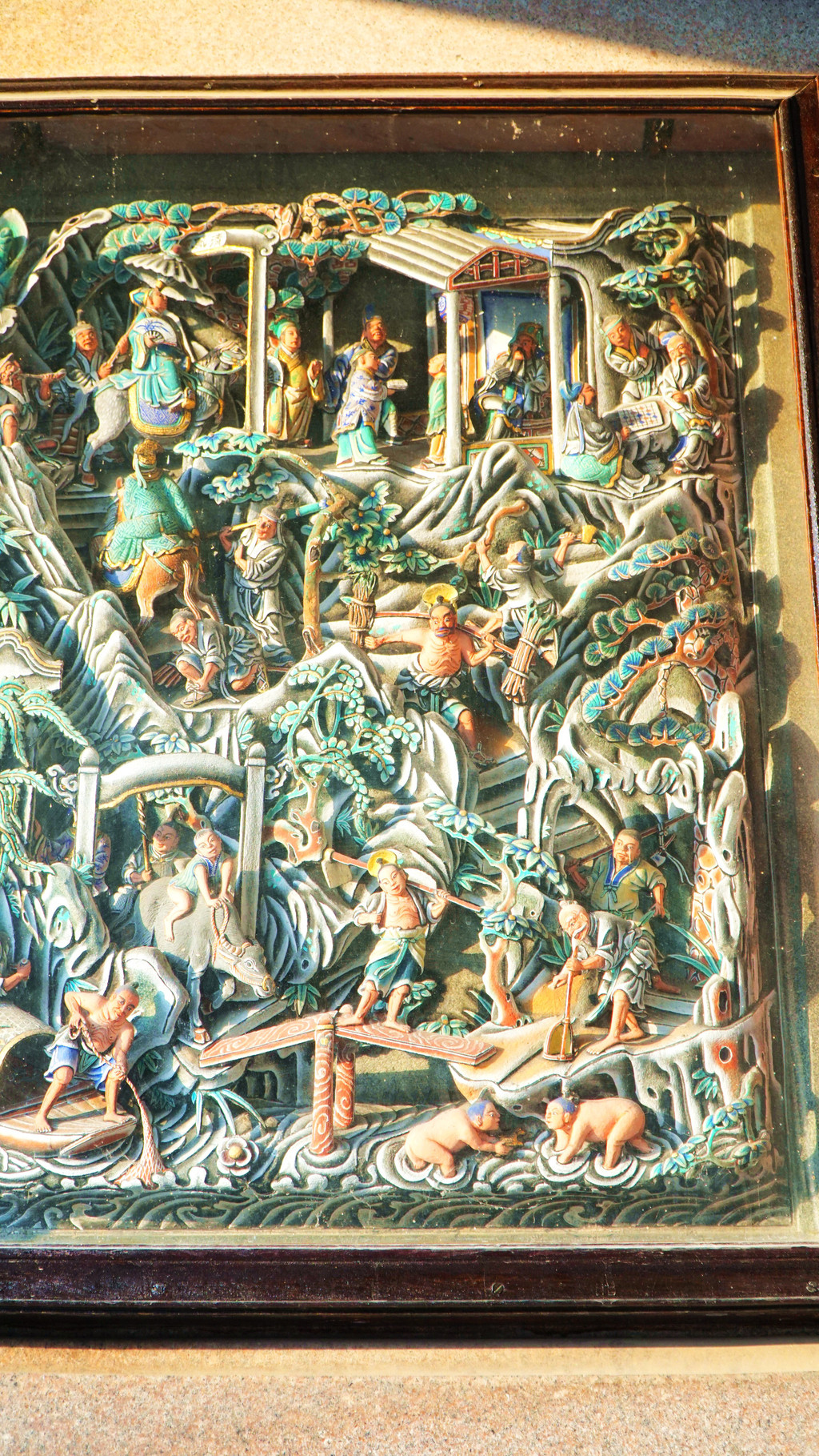 令人叹为观止的要数石壁上的四幅石雕,堪称一绝,分别以土农工商、渔樵耕读、花鸟虫鱼为题材,每幅石刻都很好地运用了“之”字形的构图,将不同时空的人、事、物集中在同一画面,设计巧妙,表现最富戏剧性的瞬间,雕工精湛更是让人惊艳。