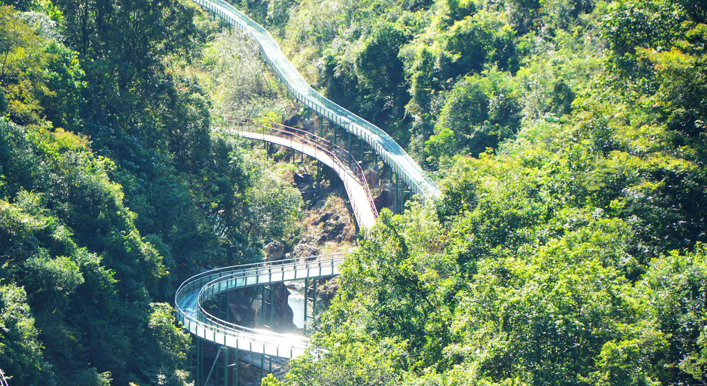 下山很便捷,可选择玻璃水滑道,穿上一次性雨衣,坐上充气船,顺着长达千米的弯弯曲曲的滑道,被水流推送着,享受着刺激和惬意。