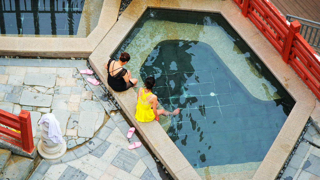 溪水在山石之间跳跃,奔流而下,充满灵性,小姐姐们戏水其间。