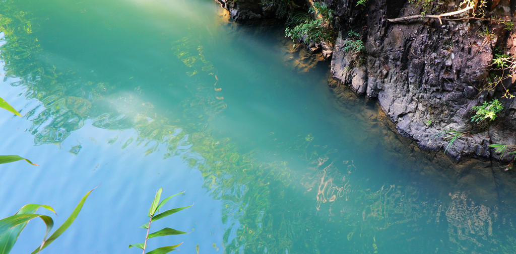 清澈的水从山顶流下,蔚蓝的可与九寨一比,湖岸的这块石头就像飘浮在湖面上,变成了“仙本那”。