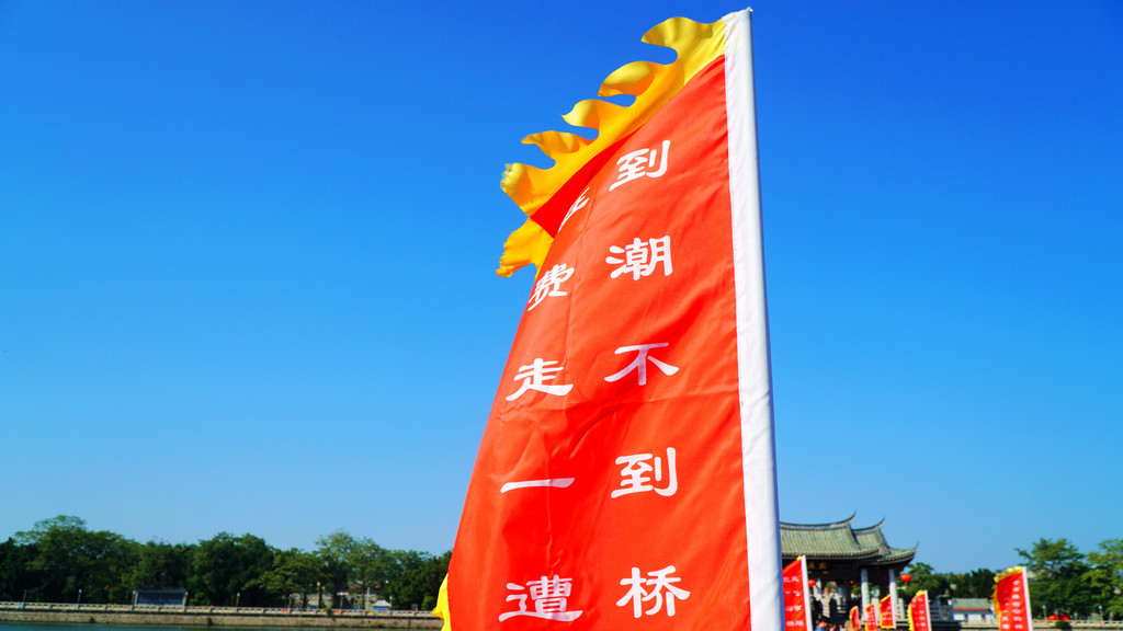 每条船上都插满了彩旗,旗上印着字,写着:到潮不到桥,枉费走一遭。足见这座桥在人们心目中的地位。