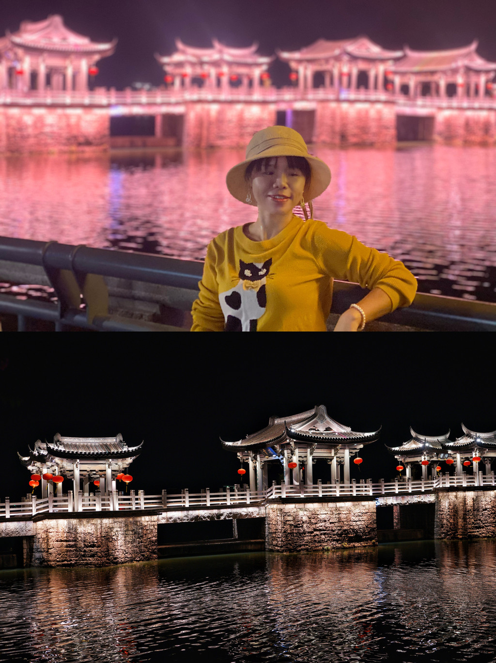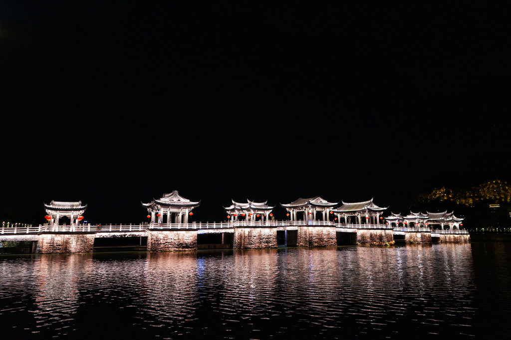 你看它近看是一座座凉亭,远看是集梁桥、浮桥、拱桥于一体的古桥。