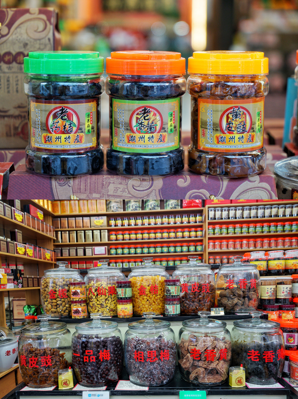 龙湖古寨的街道类似于广西的黄姚古镇,寨子入口就有许多小店。能喝到潮州功夫茶,也能买到潮州特产,如猪油糖、肚脐饼,老香黄等等。