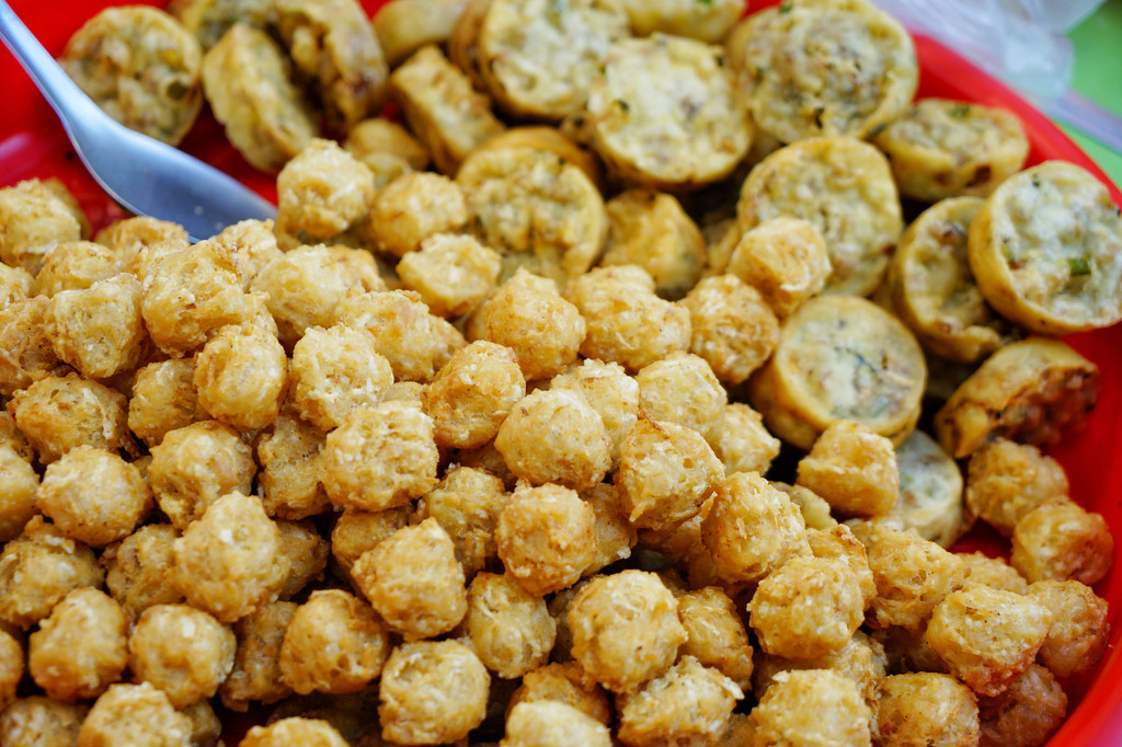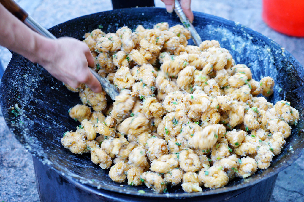 老街上也有现做的香葱麻花,花生糖、铁板煎豆腐等,张扬的香气飘满整条街,令人忍不住边逛边吃。