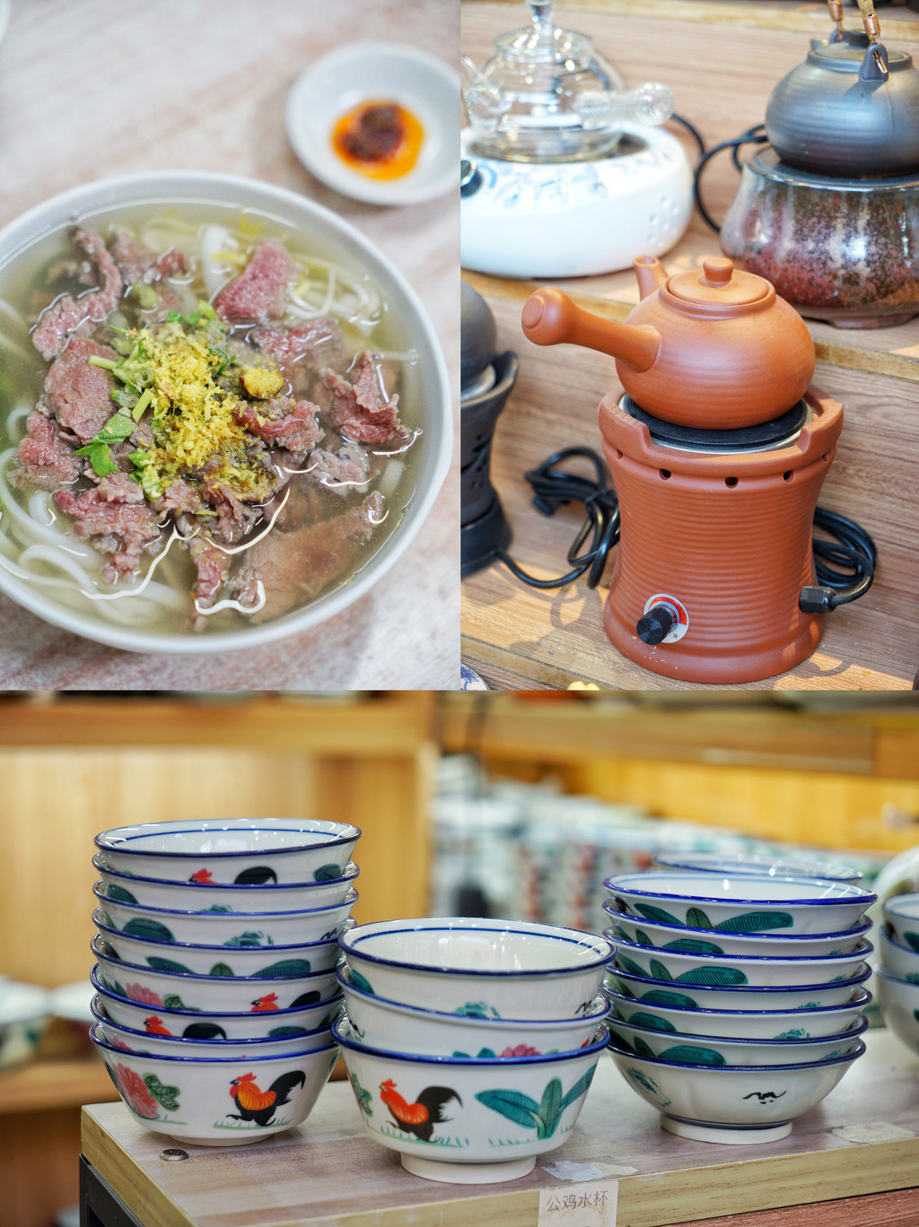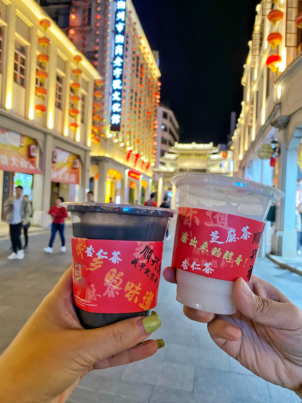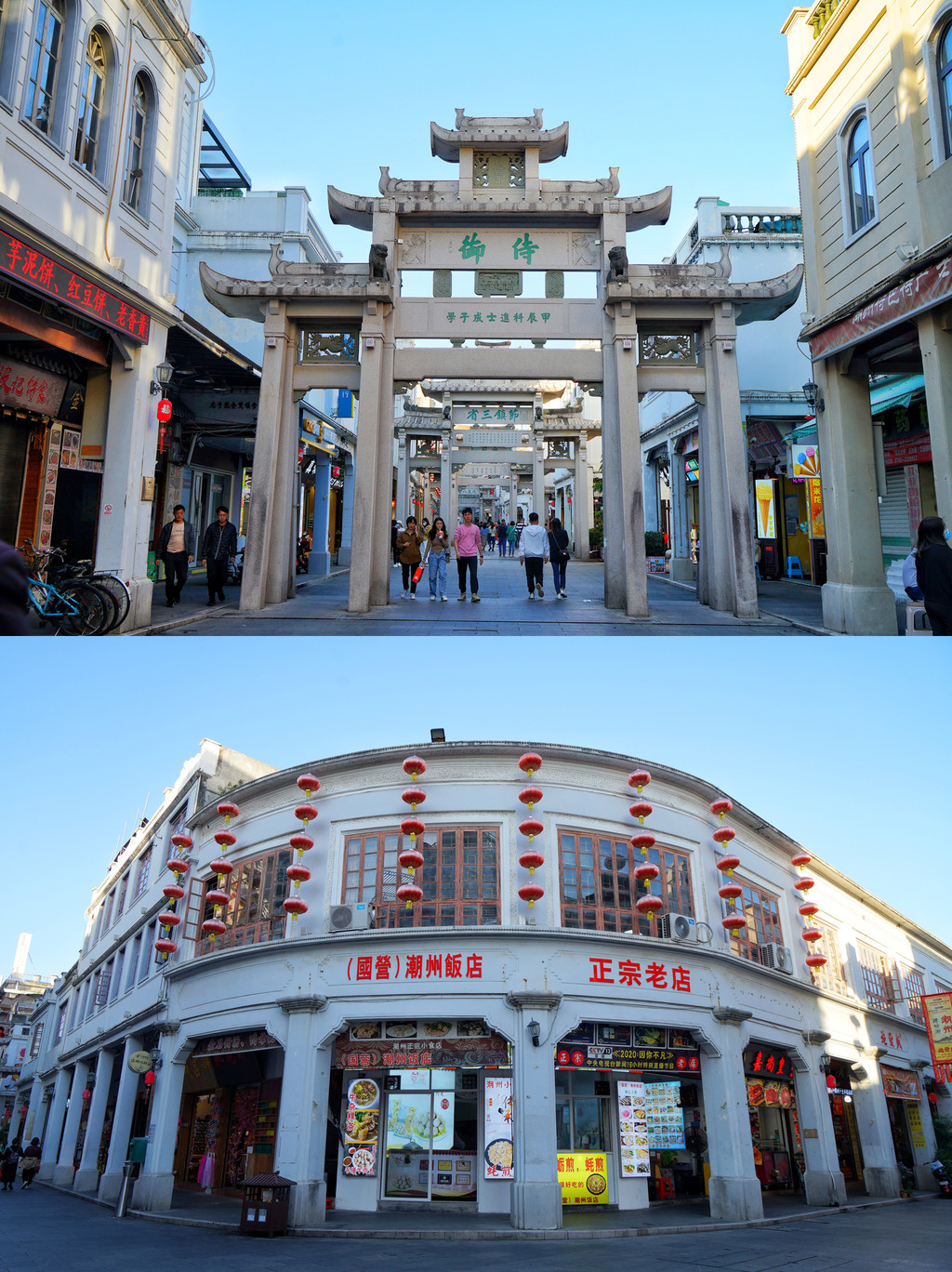 牌坊街两侧都是南洋建筑风格的老骑楼,如今都是店铺林立,有潮州老字号、地方特色小店、民宿、饭店等等,这里既有诱人的潮州美食,如潮州三宝、牛肉火锅、粿条、腐乳饼、甘草水果、鸭屎香茶,还有潮州非物质文化遗产,潮绣、手拉壶、陶瓷、工夫茶等等。