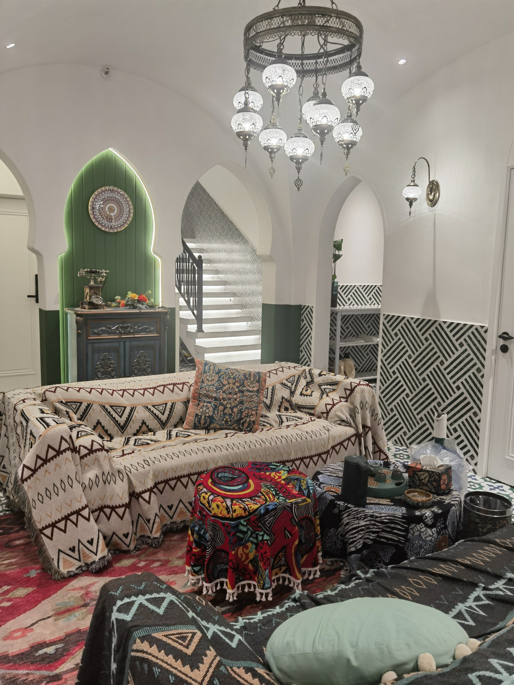 一进门,一楼公区就很“哇噻”,满屏摩洛哥风情,丰富的色彩搭配起来,超出片;主人的品味很高,连茶具都是摩洛哥本土的,满满的高级感令人觉得一切都很值得~