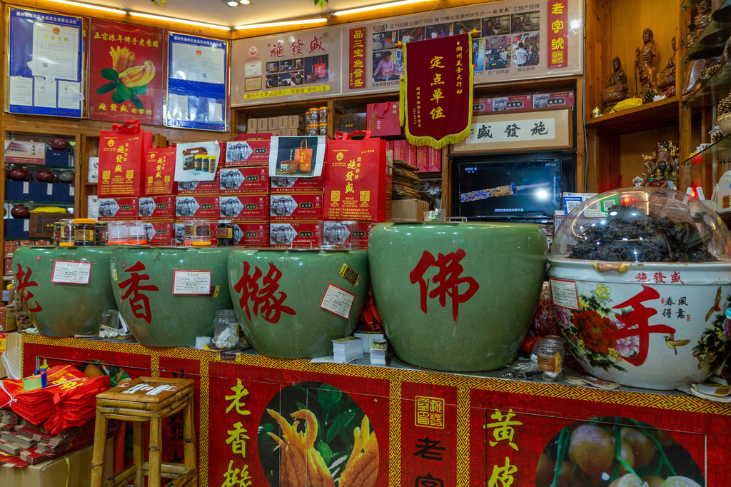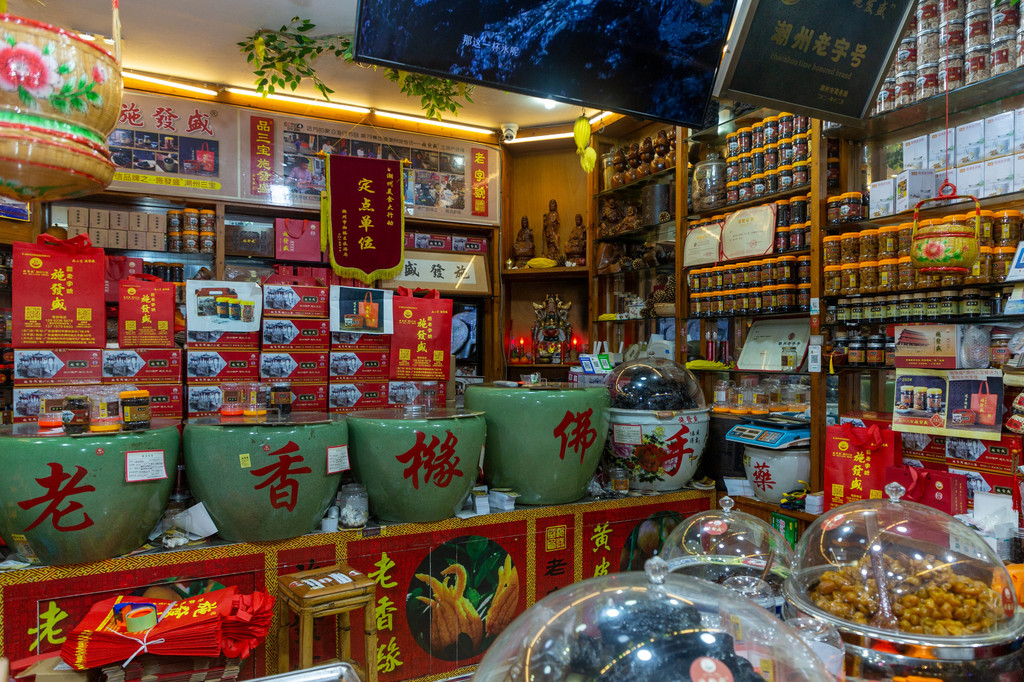 谈到潮州的手信,一定要选潮州三宝:老香橼、老药桔、黄皮豉。在施发盛,可以一次性选到陈年的,新制的三宝。