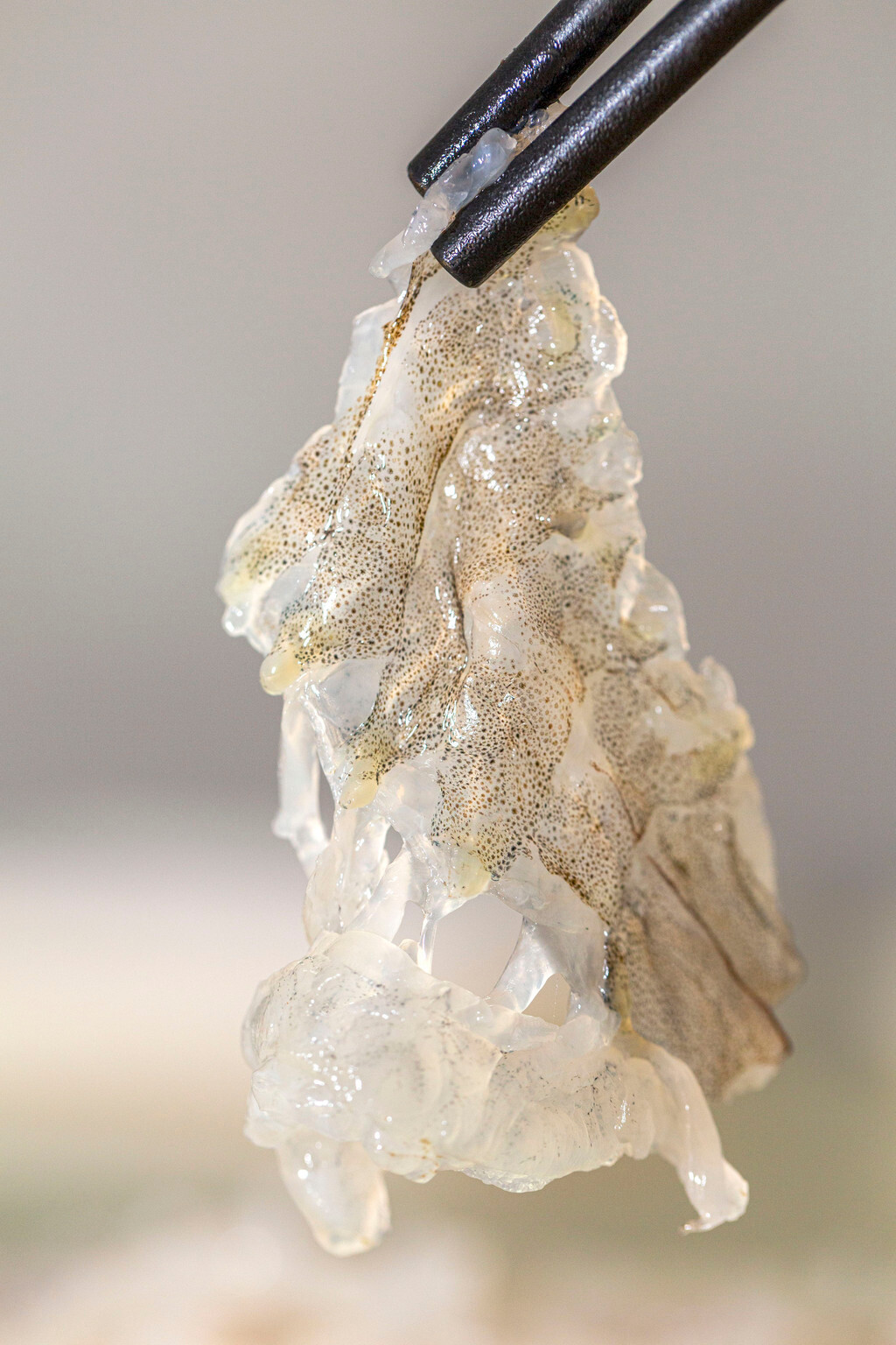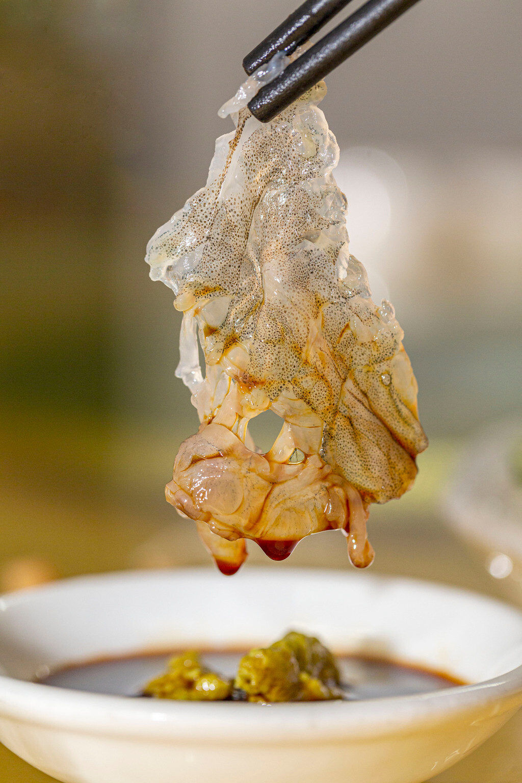 虾生比鱼生鲜甜得多,而且虾生厚肉,吃起来口感更丰腴、霸气一些,配上芥末酱油,越吃越爽。