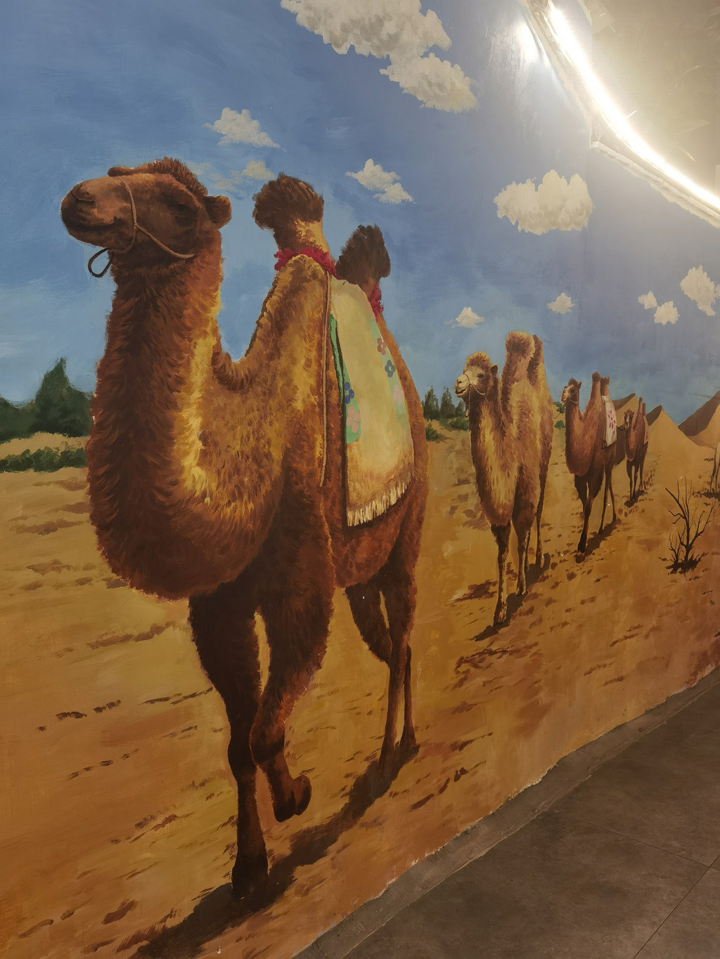 从儒学宫的牌坊进去大概200米,一条直路,穿过小巷子就到了,也可以喊管家用电瓶车接送,十分友好。巷里摩洛哥的“巷里”,就有一幅长长的骆驼壁画,开启疯狂拍照模式。
