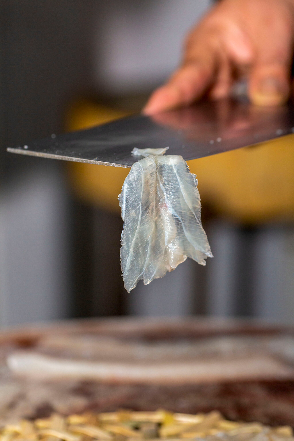 在潮州,无论春夏秋冬,鱼生都是受欢迎的,但对于外地人而言,更关心的是鱼生的卫生程度,这家炎记鱼生店虽小,却特别干净卫生。草鱼柳在师傅手里,只需几分钟,便拆骨起肉,手起刀落地片成透光的鱼生薄片,撒上芝麻提香,配上灵魂酱汁豆瓣炸蒜油,外加一份油甘子、洋葱丝、香菜等组成的配菜拌匀,鱼肉的鲜香扑鼻而来,爽实的口感令人无法自拔。