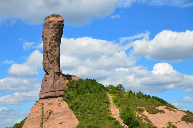 棒槌山,摸到棒槌山,能活三百三,呵呵……一个很美丽色噱头。在棒槌山看山庄,布达拉宫,永乐寺,定远庙,感慨万千哟!磬锤峰国家森林公园环抱承德市区,与驰名中外的避暑山庄和外八庙风景名胜镶嵌相融,景区内有一挺拔峭立的石柱擎天而立直插云端,形如洗衣用的棒棰,故康熙皇帝赐名“磬锤峰”,俗称“棒棰山”。