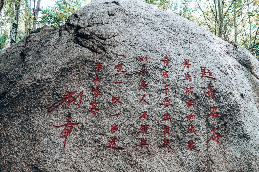 著名诗人刘章《题奇石谷》云:“丹岩绿树响流泉,奇石千姿出自然,对景无人不雅兴,一观一叹一留连”。