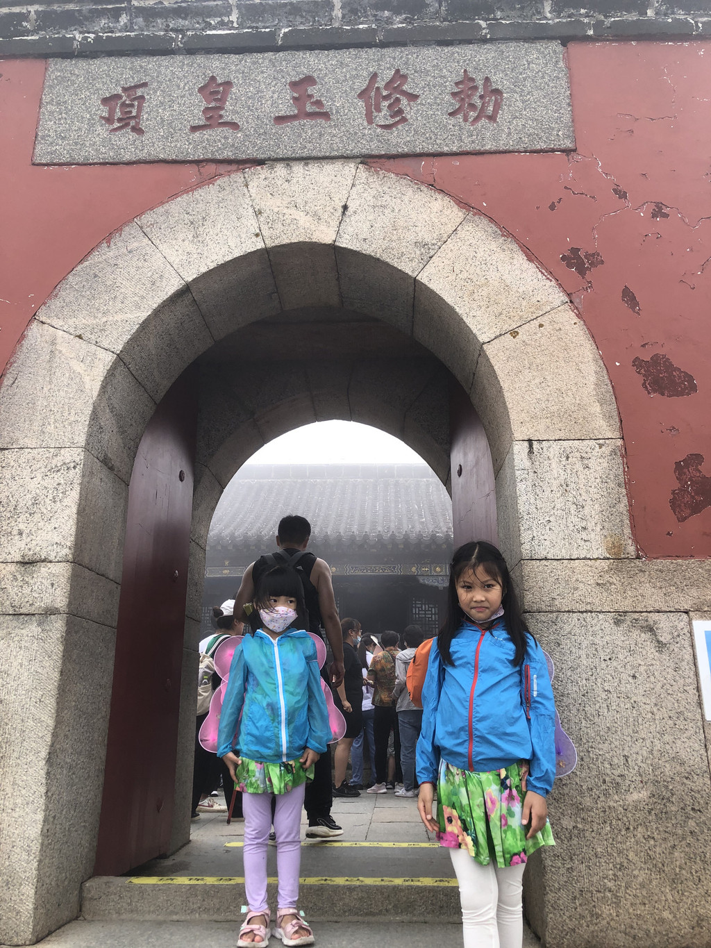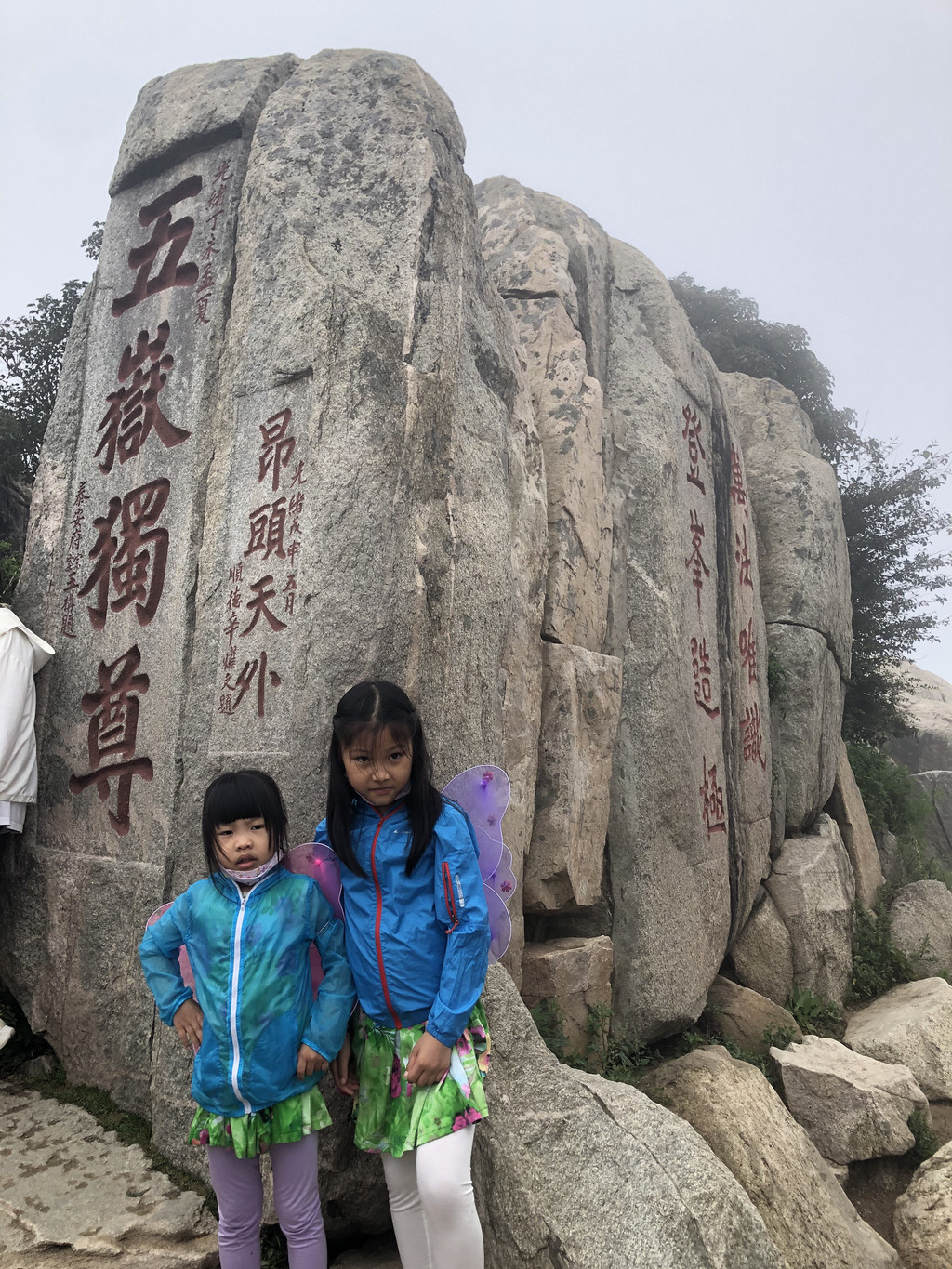 今天的泰山小雨,雾很大,9:30出发,开车到桃花峪进山,先坐景区大巴,再坐缆车上山,上到山11:00,从天街牌坊徒步往玉皇顶走,因为雾大天气有点凉,大概22度左右,帮小朋友带了风衣,穿上就没事了。从天街到碧霞寺看了看碧霞寺的泰山奶奶,就一直都是上台阶的,先到“唐摩崖”,主要看唐代李隆基写的泰山颂,然后继续往上走,就到了五岳独尊,两姐妹自己去爬山了,