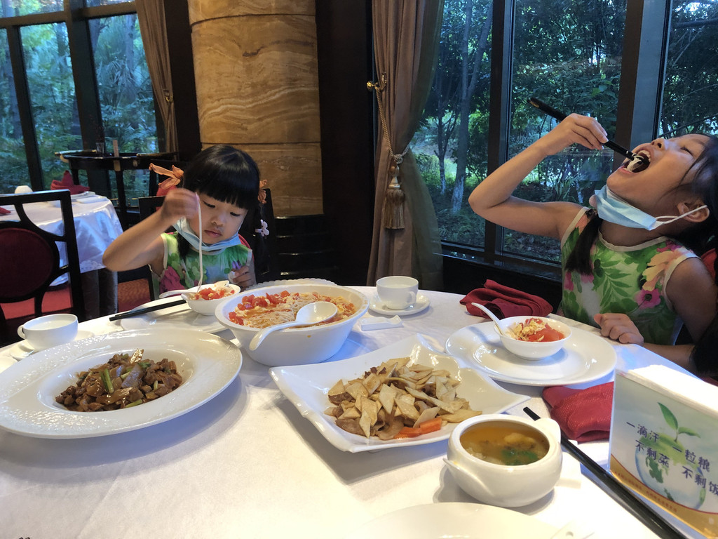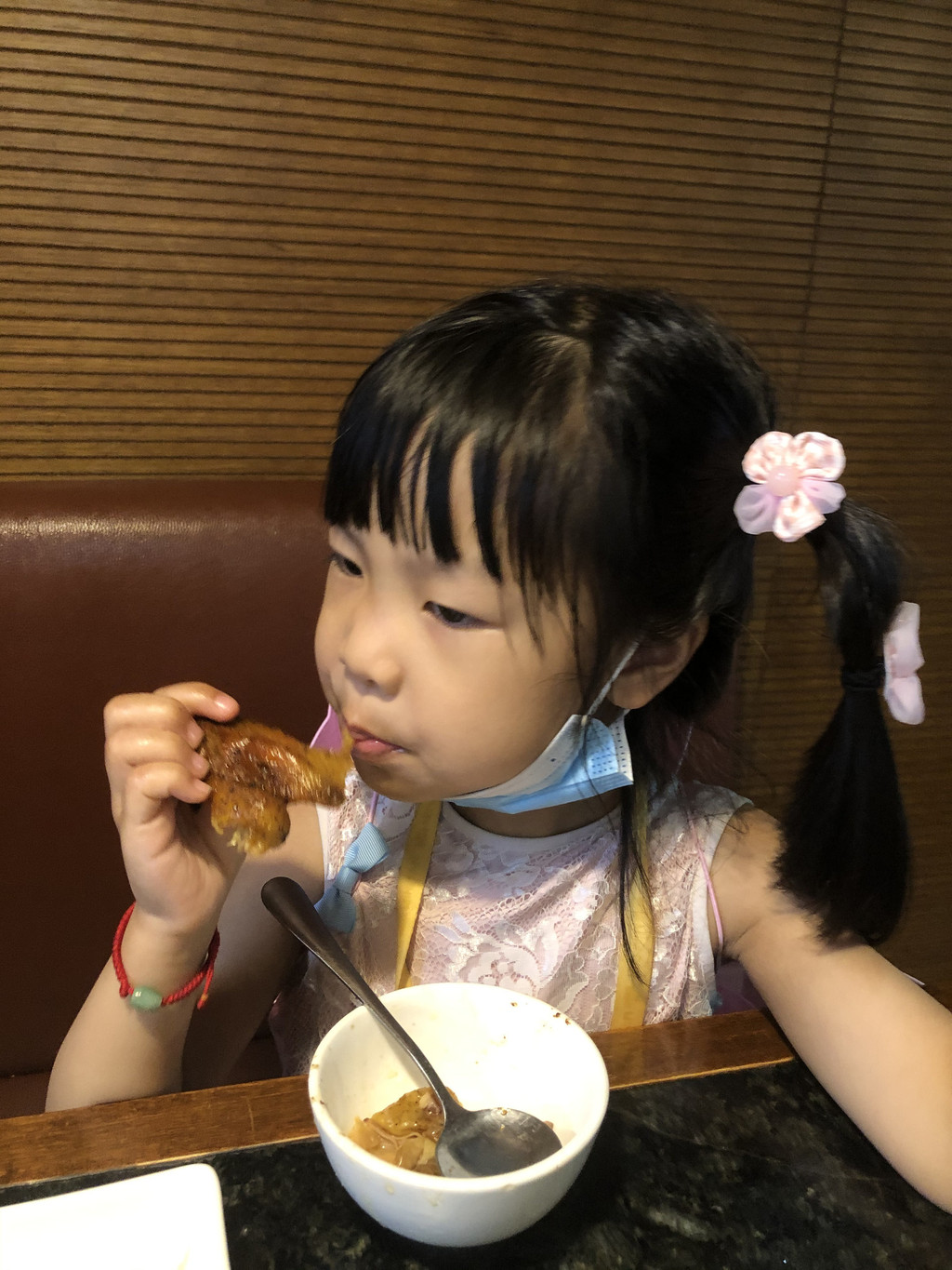 坐车去酒店附近的盒马购物,一人一个椰子汁,买新疆桃子,葡萄,还有面包。重点是去酒店旁边的“杭州饭店”吃饭,点了名菜叫化鸡,鸡肉香嫩,俩姐妹把整只鸡吃光了,吧哒吧哒的好好吃,