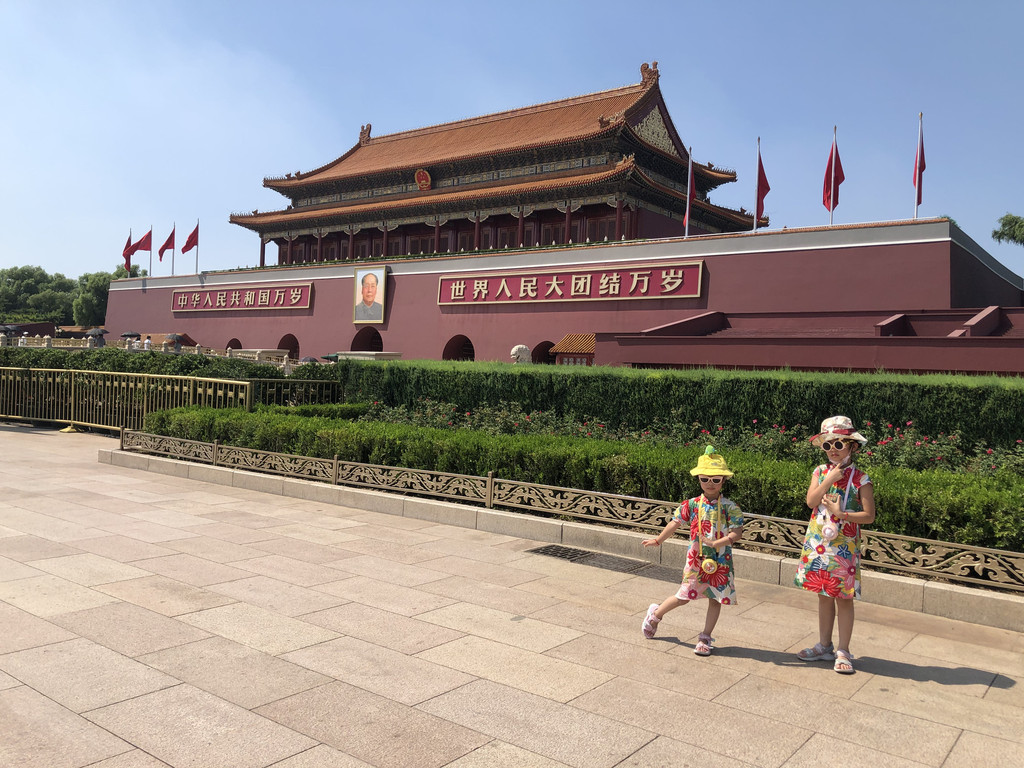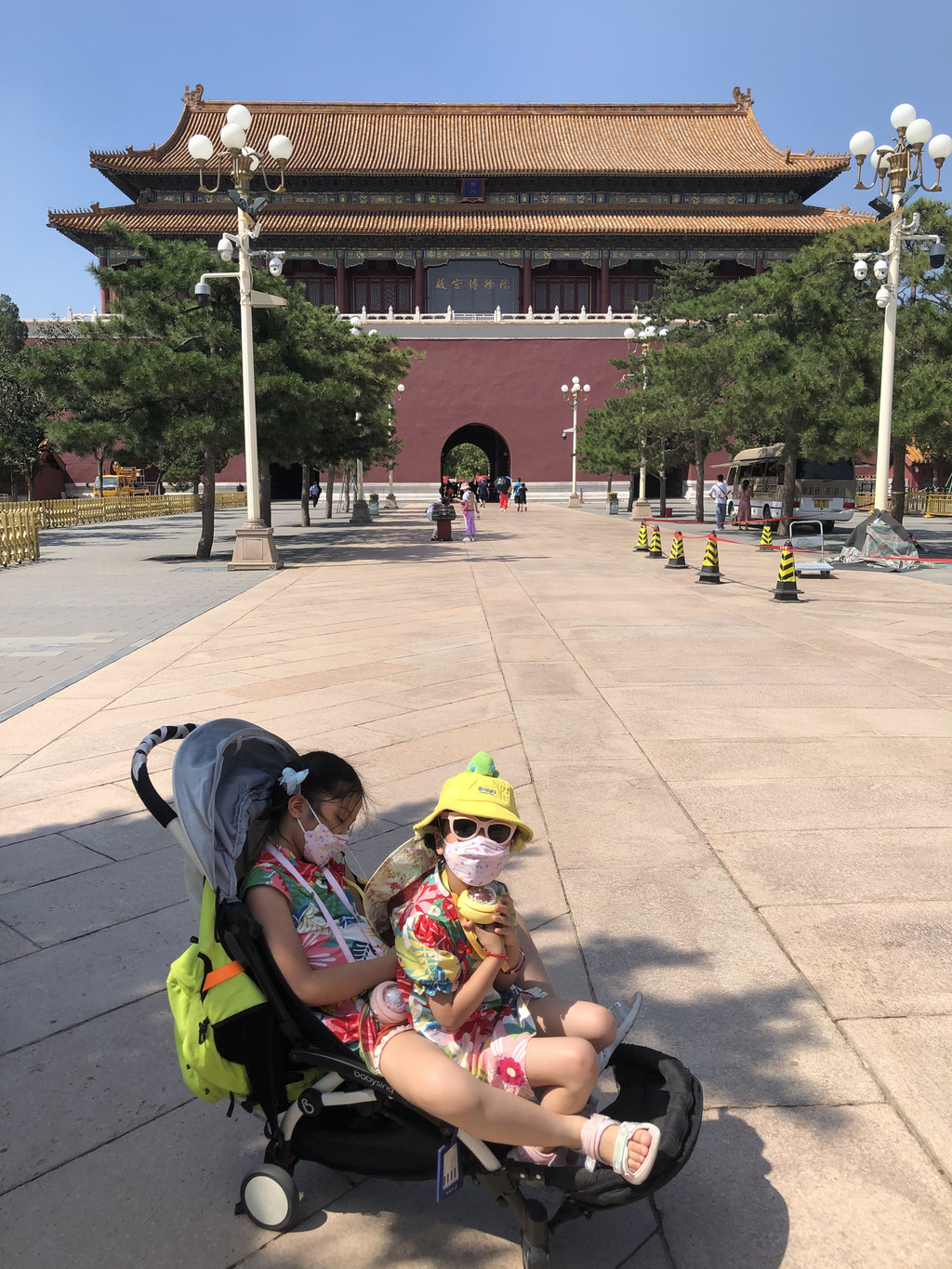 天安门是今天的重点,妹妹是第一次来。天气真的很热,两姐妹全副武装眼镜帽子风扇全带上。
