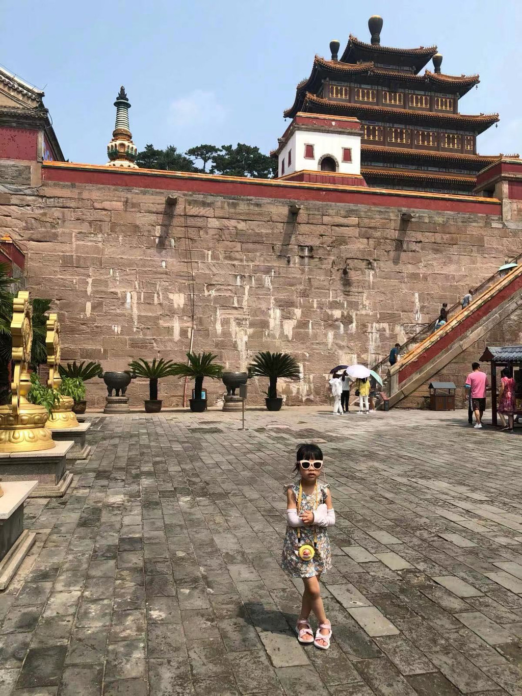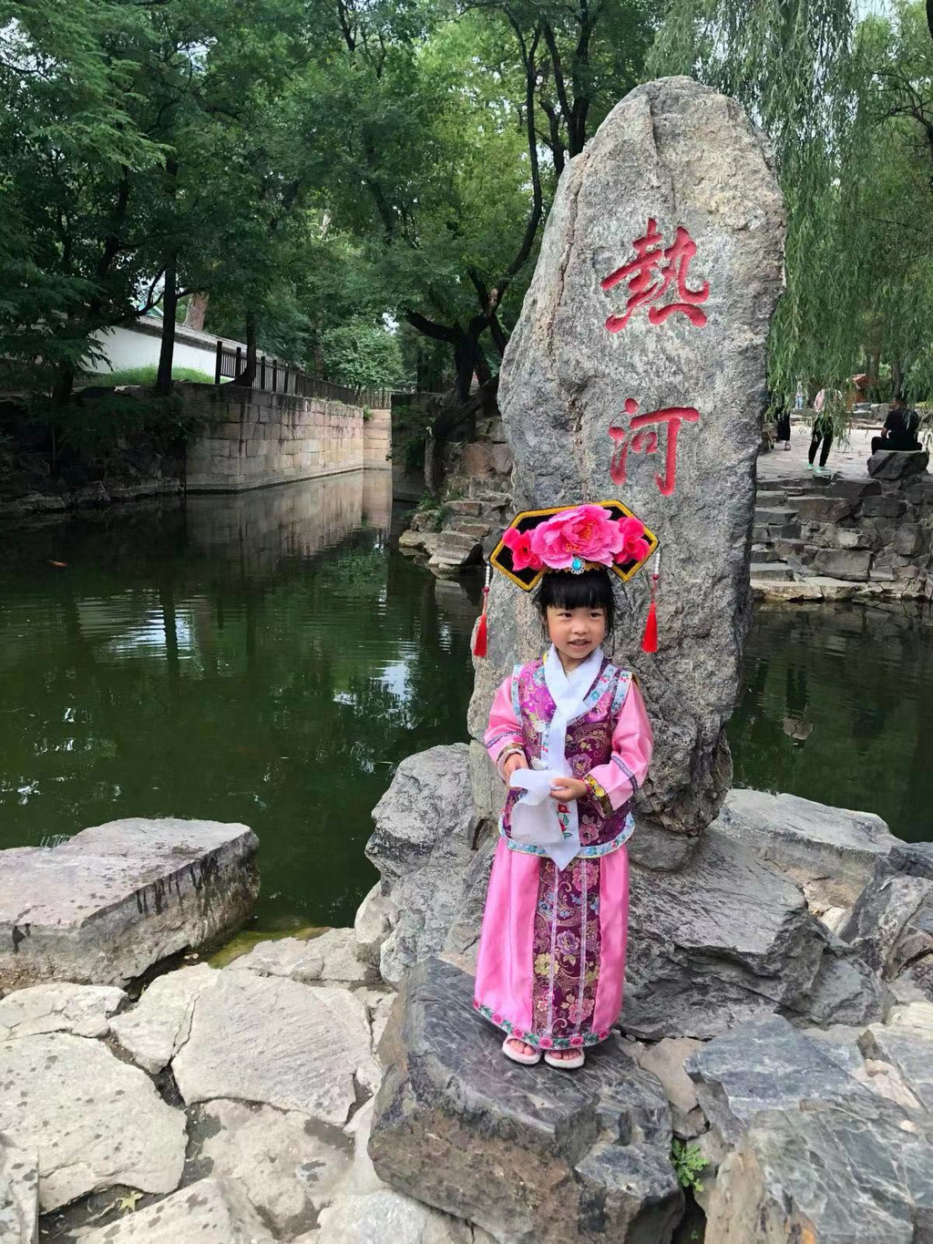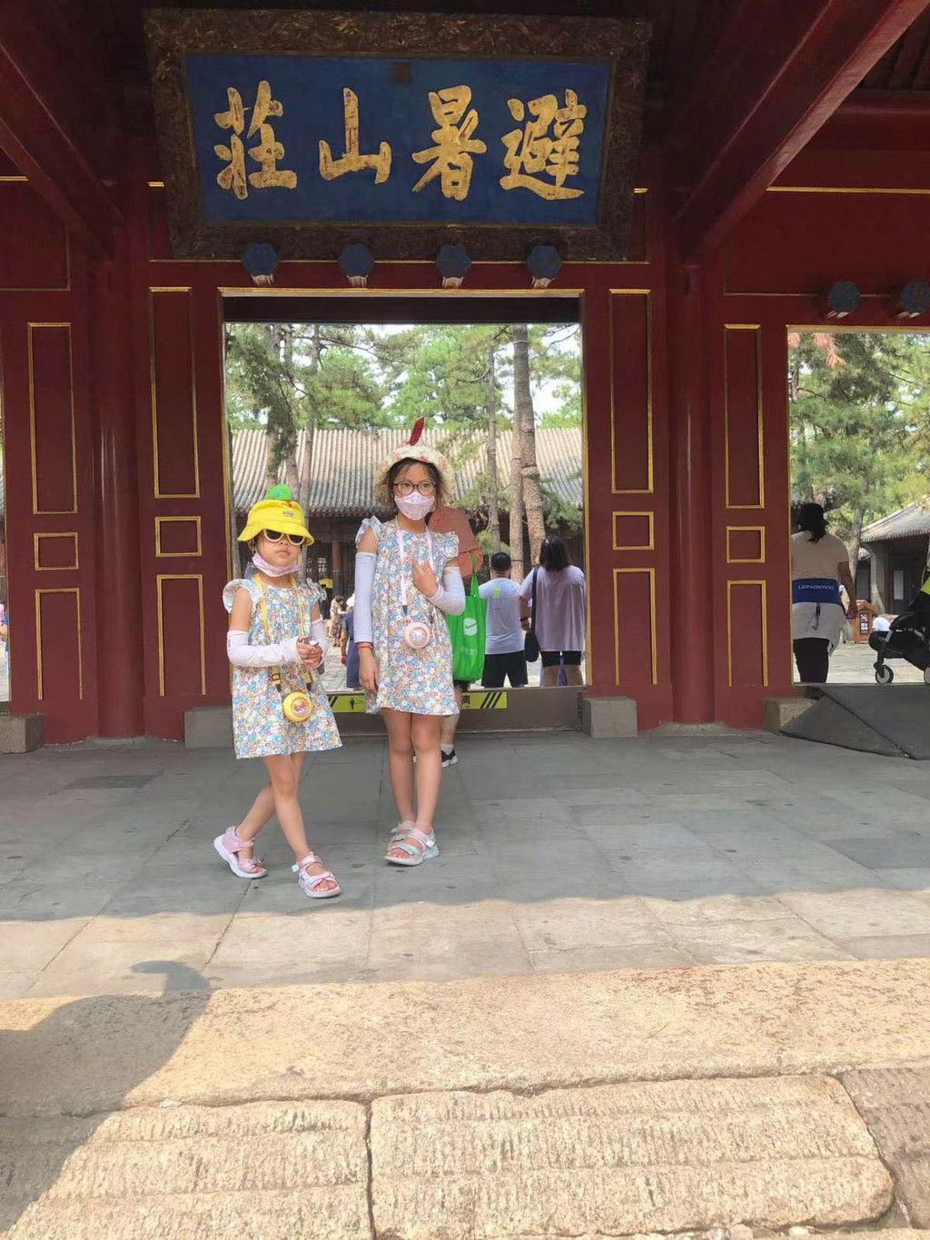 中午13:00游览承德避暑山庄。一入山庄,凉风习习,整个人爽爽的,真是避暑胜地,沿着湖区去到烟雨楼,拍还珠格格的地方,俩姐妹在前面对山斋的假山玩到不亦乐乎,不愿离开。来到热河,租件格格衣服给俩姐妹拍照,穿衣打扮好,晴格格安格格出场,姥姥负责拍拍拍,姐姐还专门带了昨天在小金楼买的剑,耍了几道,挺可爱的。