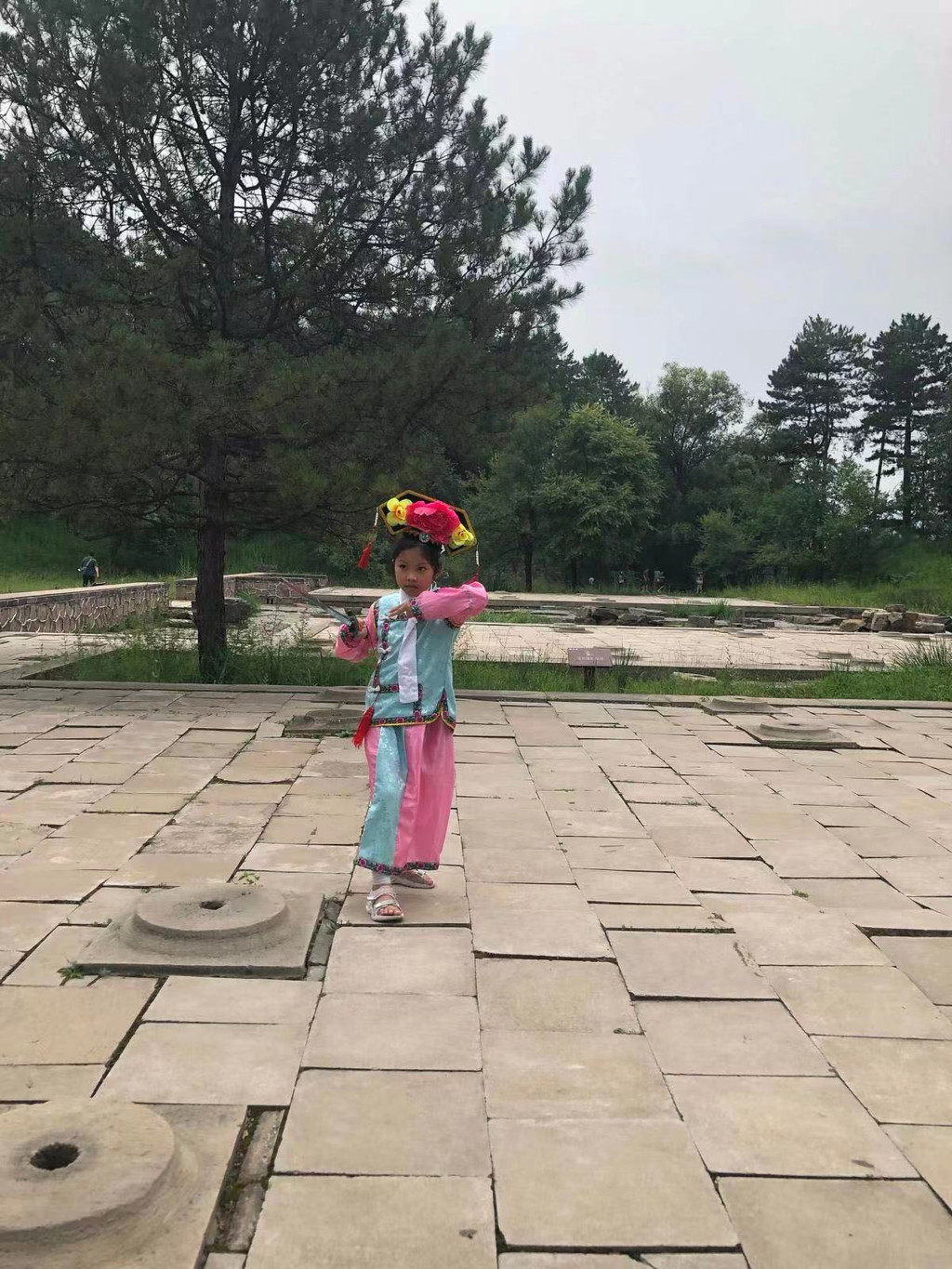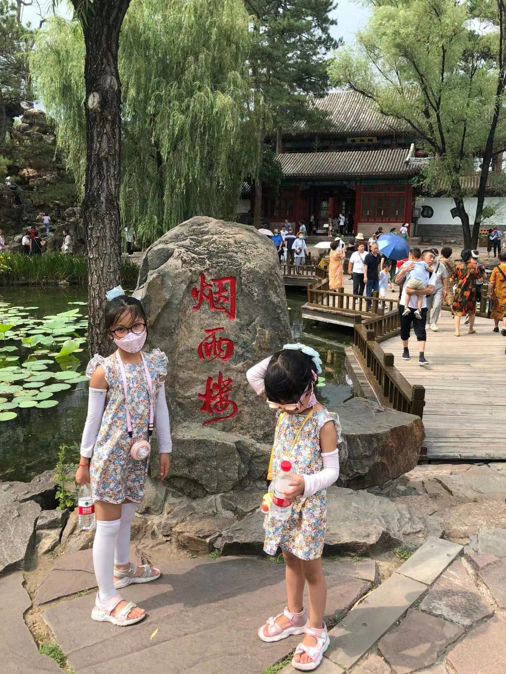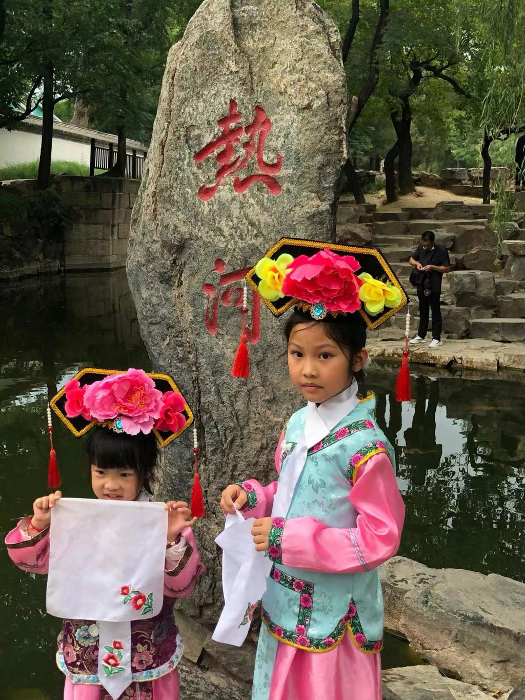 中午13:00游览承德避暑山庄。一入山庄,凉风习习,整个人爽爽的,真是避暑胜地,沿着湖区去到烟雨楼,拍还珠格格的地方,俩姐妹在前面对山斋的假山玩到不亦乐乎,不愿离开。来到热河,租件格格衣服给俩姐妹拍照,穿衣打扮好,晴格格安格格出场,姥姥负责拍拍拍,姐姐还专门带了昨天在小金楼买的剑,耍了几道,挺可爱的。