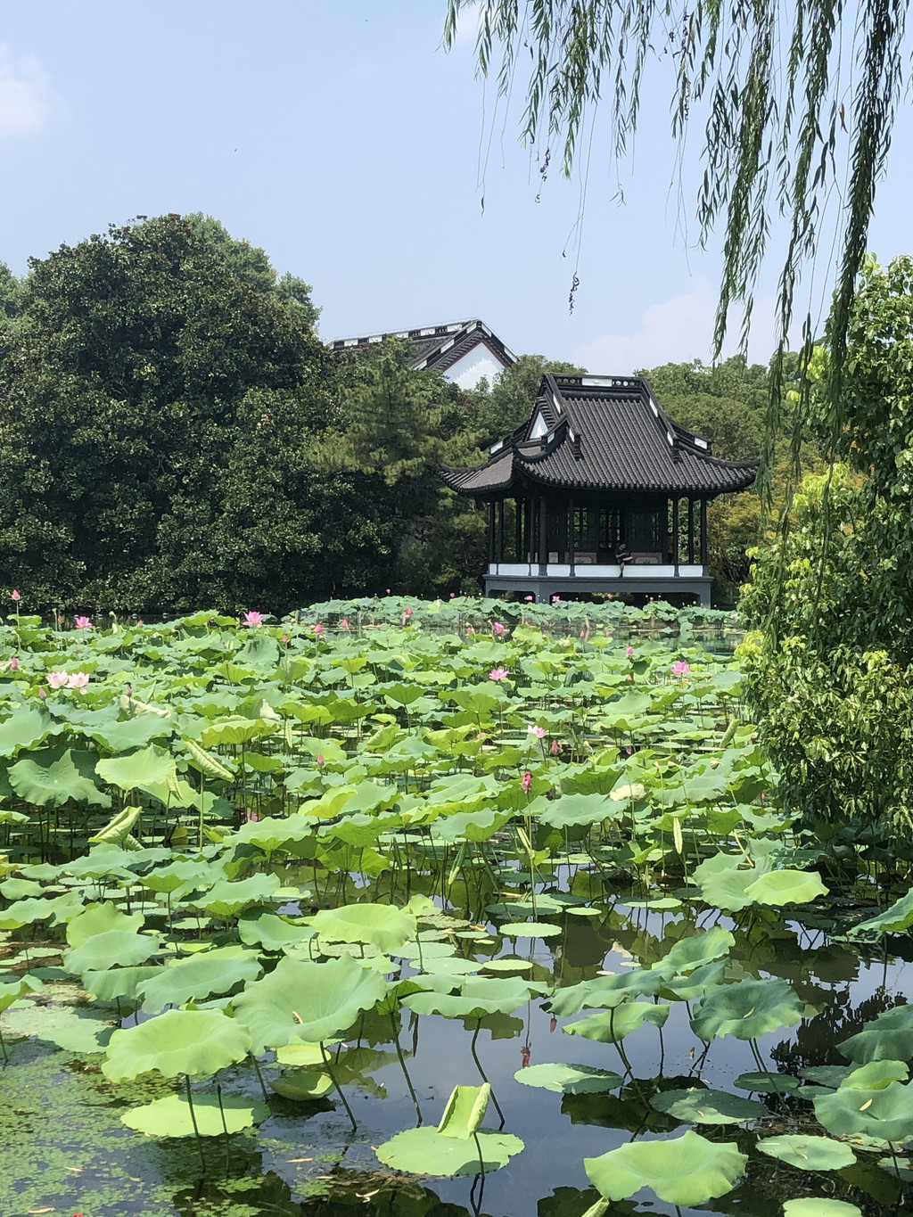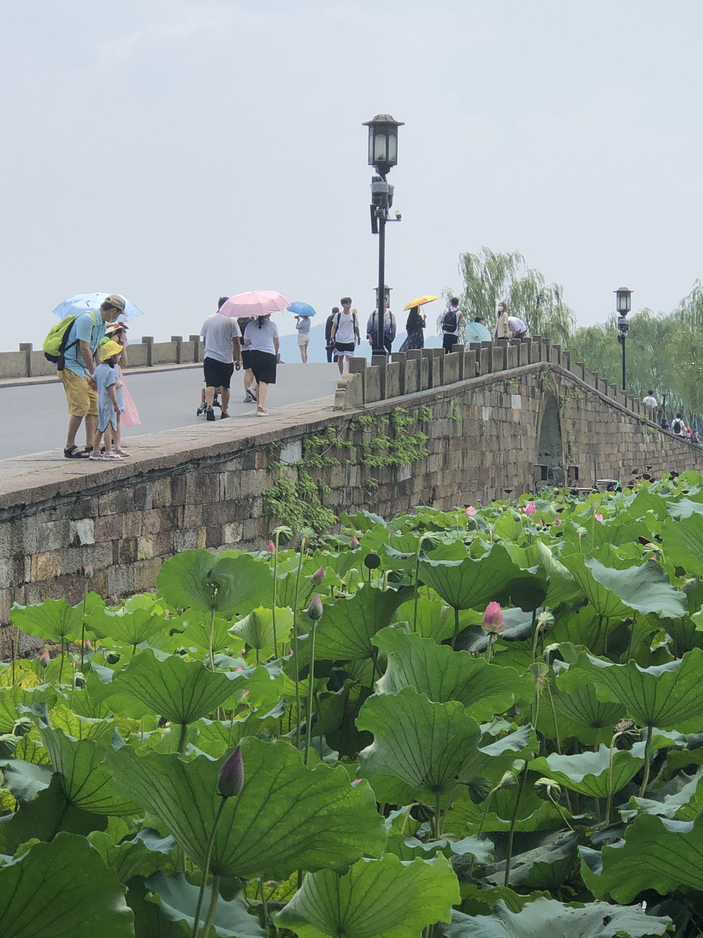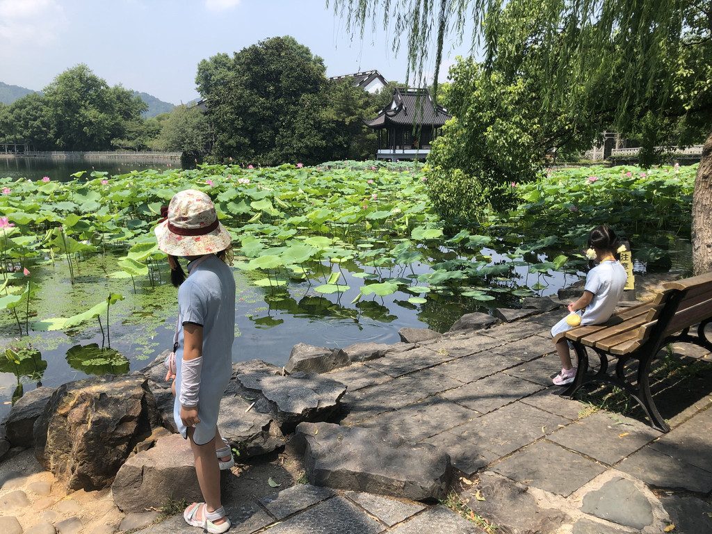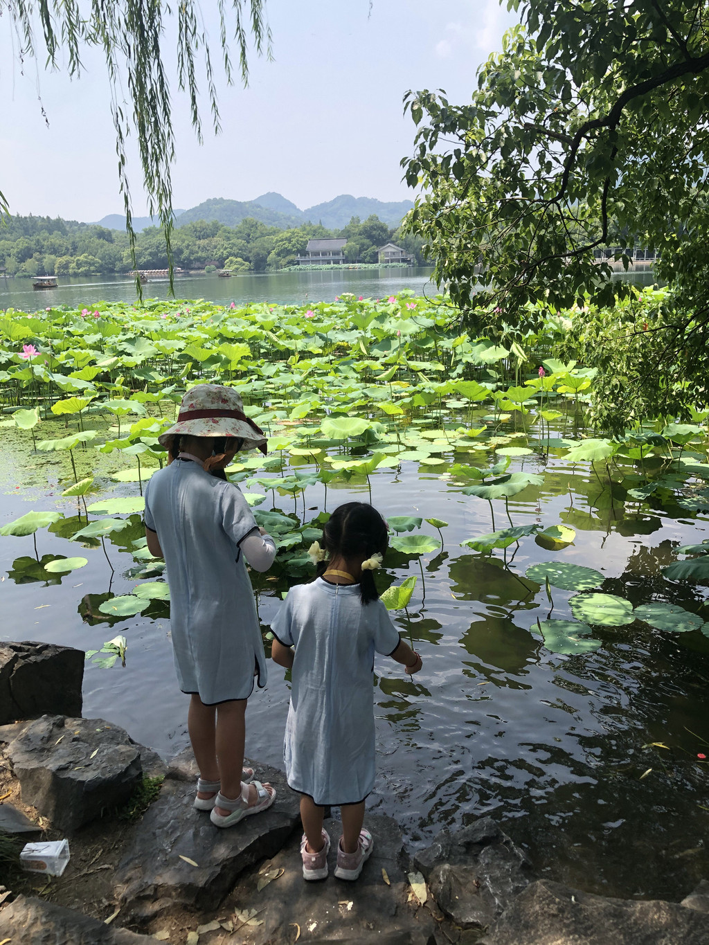 今天杭州的温度很高,起码有40度,我们10:30出门了,打车去花港观鱼,从西门进去比较近一点,带着姐妹俩在树荫下走,但气温太高了,感觉很热很热。姥姥是第二次夏天来西湖,之前同阮同学来的,依希记得“曲院风荷”的荷花,这次满足姥姥愿望,坐车转了西湖一圈,满目皆是荷花盛开,粉红、白色的,有大朵的、细朵的,争相辉映,鸟语花香,令人目不暇接。气温高了些,去到“红鱼池”喂了些鱼,实在呆不下去,迅速离开,直接去“断桥残雪”景点,带俩姐妹上桥走几步,拍几张照片,看看桥边的荷花,坐车回酒店。